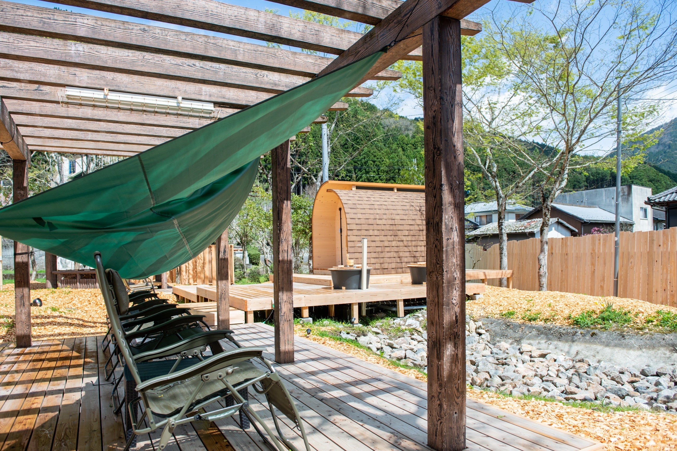地下水を汲み上げた水風呂に、小学校時代の藤棚を活用した、ととのいスペース。