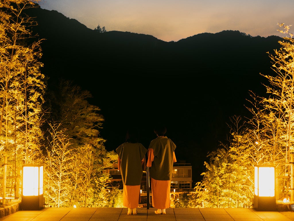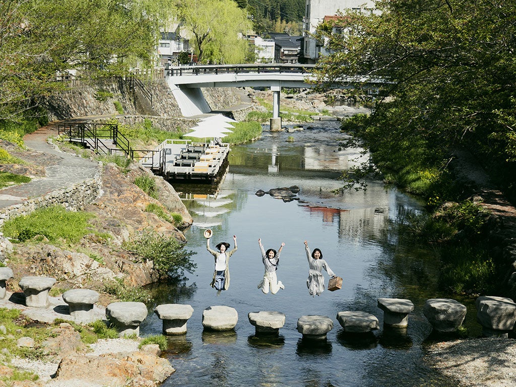 山口県でもっとも古い約600年の歴史をもつ長門湯本温泉は、「そぞろ歩き」が楽しめる温泉街として2020年春にリニューアル。観光まちづくり計画が進む温泉街には、地域の若手によって再建されたモダンな立ち寄り湯「恩湯(おんとう)」や星野リゾート 界 長門のオープンに加え、山口県初となる川テラスや飛び石、街中を照らす幻想的なライトアップ、レストランやカフェなどが続々と開業。温泉街の真ん中を流れる音信川(おとずれがわ)沿いには、たくさんのソメイヨシノが植えられており、春には桜目当ての多くの観光客で賑わいます。