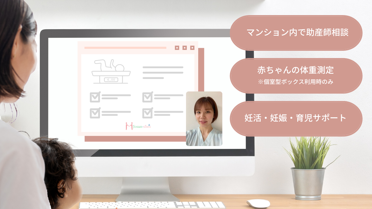 ご自宅に加えて共用部分に設置された個室型ボックスで、 助産師にオンラインを通して、妊活、妊娠、育児相談が可能