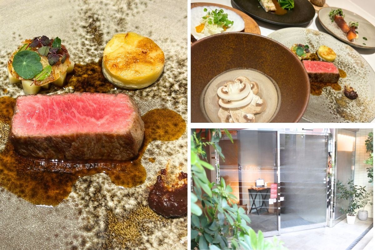 『流水牛サーロイン(紅あかり、肉のジュ)』(左)、『流水牛コース』(右上)、外観(右下)