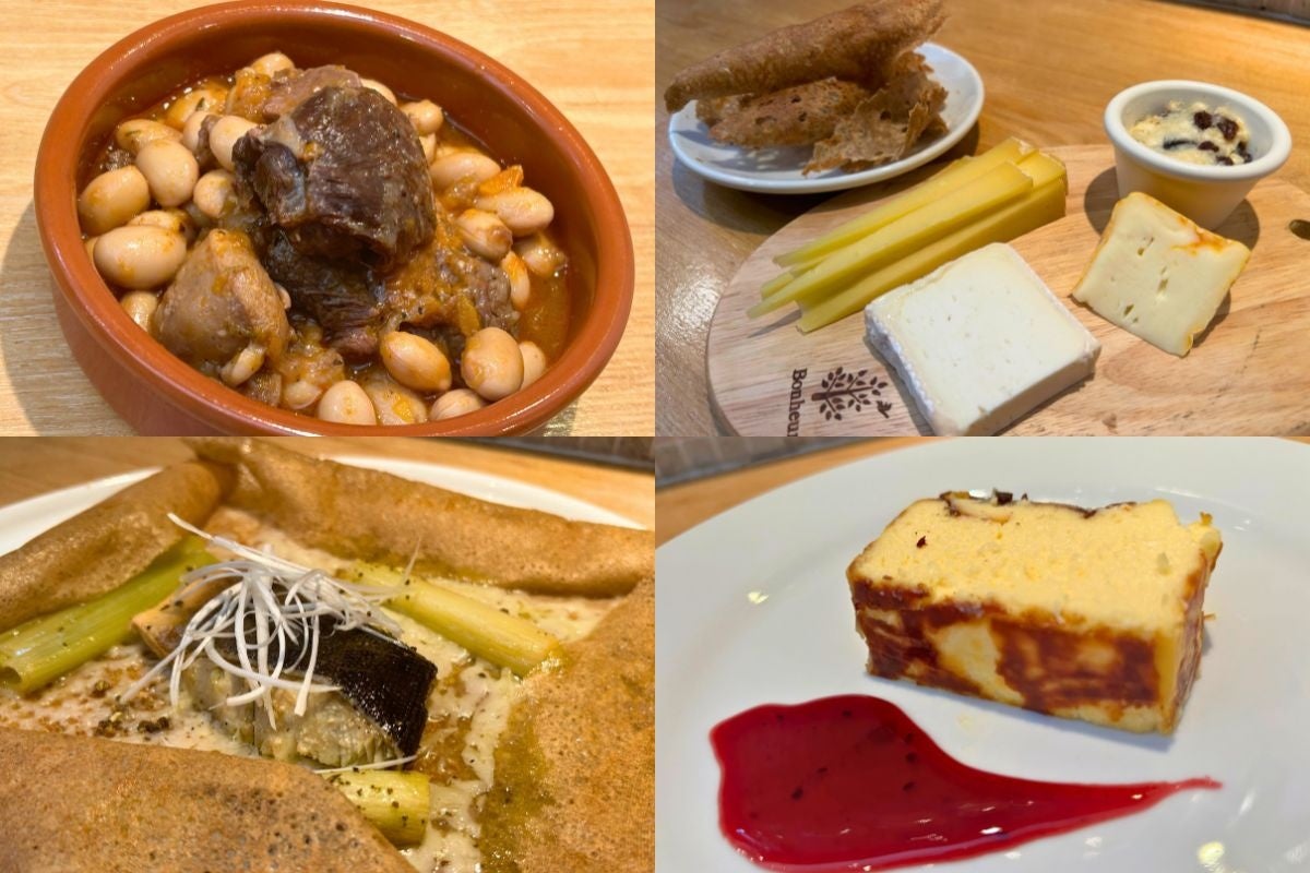 『森と大地の恵み 蝦夷鹿と大豆のカスレ』(左上)、『オホーツクミルクの恵みプレート(チーズ3種とミルキーな発酵バターをレーズンバターに)』(右上)、『オホーツク近海 ホッケと⻑ネギのコンフィのガレット』(左下)、『マスカルポーネのバスクチーズケーキ』(右下)