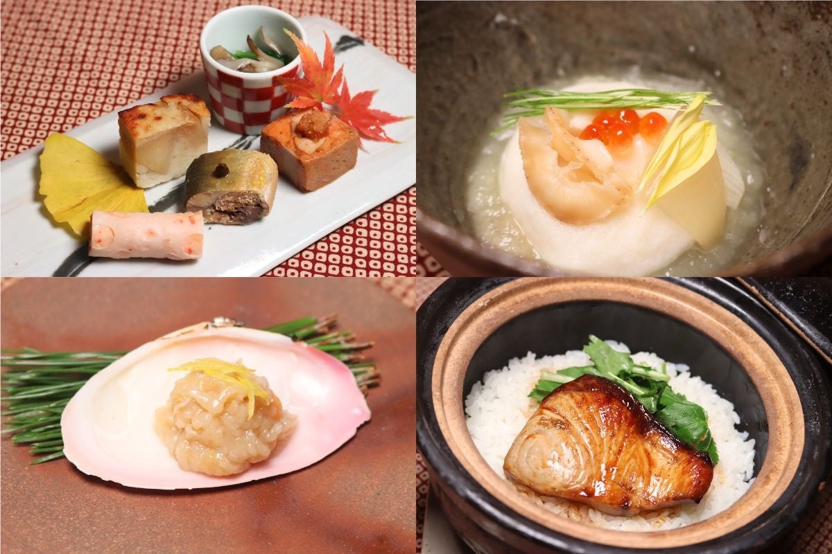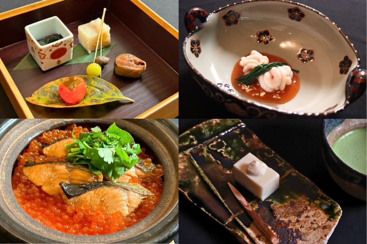 『白貝と聖護院蕪の寄せ物、金時草のお浸し、真鰯の梅煮、柿玉子、銀杏と零余子の松葉串』(左上)、『雲子の柚子塩仕立て 菊菜 敷いくら餡』(右上)、『オホーツク常呂沖産 秋鮭といくらの土鍋ご飯』(左下)、『紅あかりの羊羹』(右下)