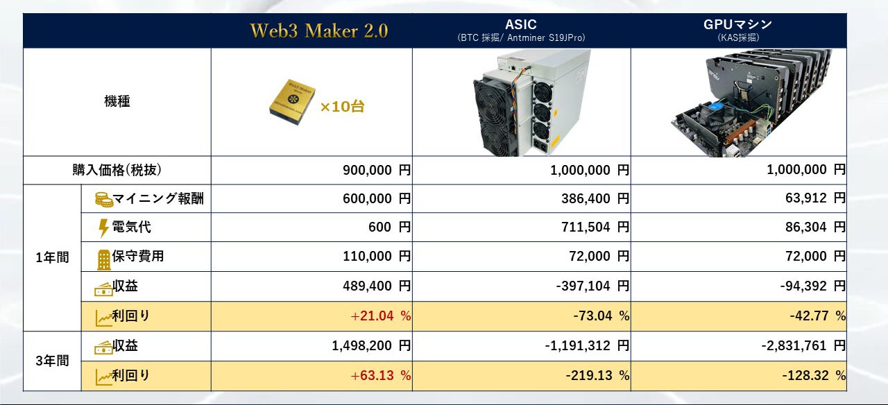 「Web3maker®2.0」と他機種のマイニングマシンの価格性能面での比較は以下のようになります。