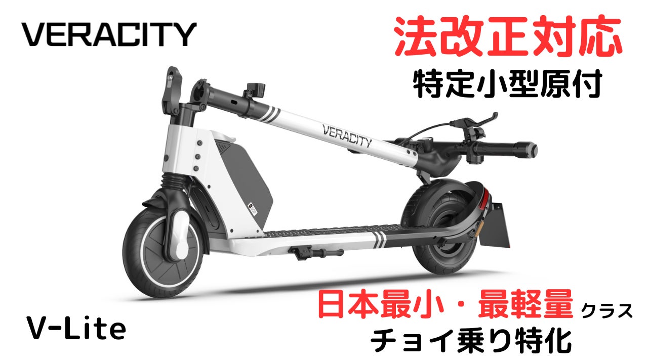 「V-Lite」は16歳以上であれば免許不要(ヘルメット着用は努力義務)で乗ることができ、特定小型原付として登録可能な電動キックボードです。日本最小/最軽量クラスで毎日のチョイ乗りに特化したデザイナーズ電動キックボードが新登場!