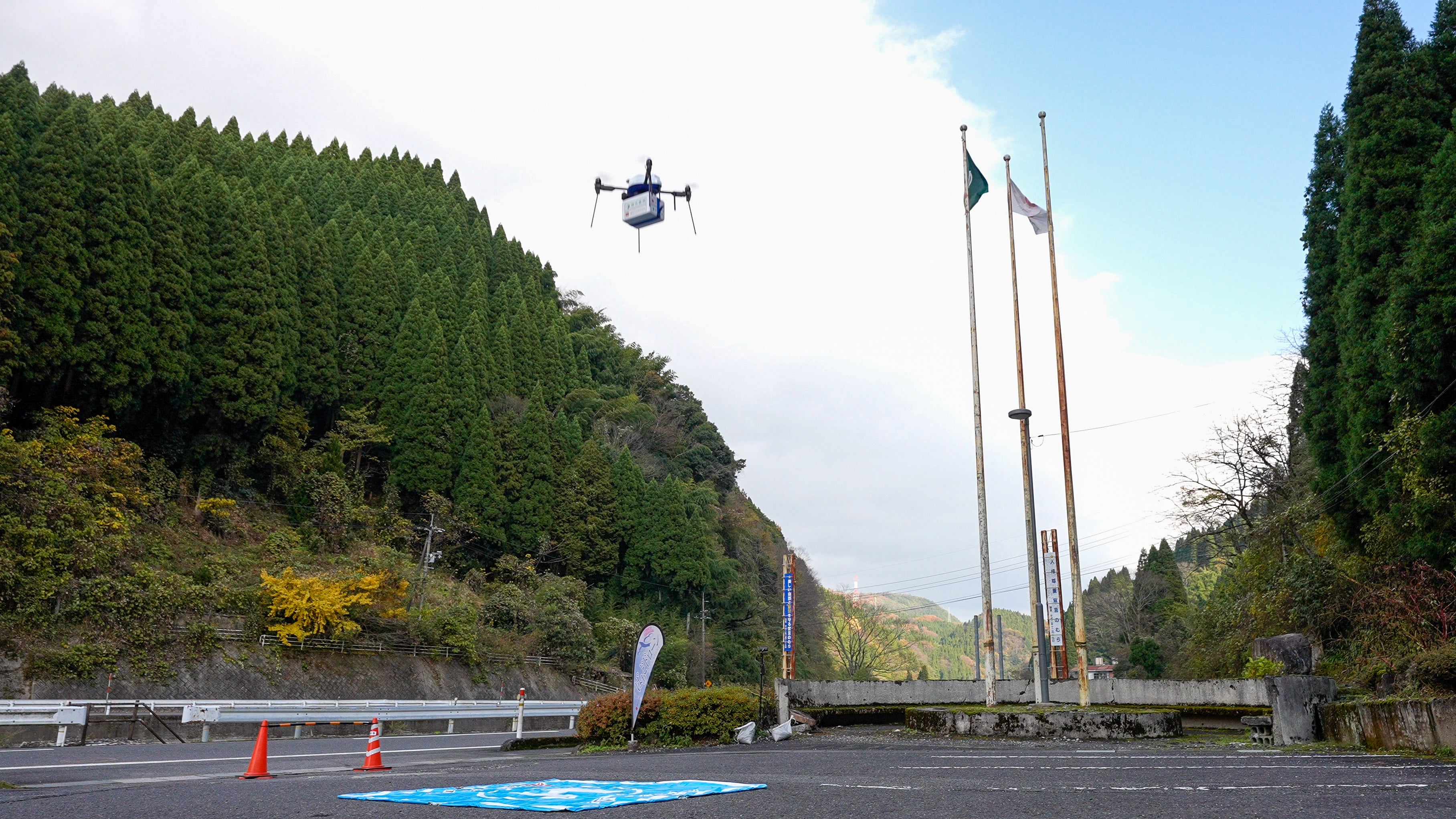 台風災害により陸路が寸断された鳥取市佐治町津野地区住民への専門医による診療と必要な医薬品の提供を想定し、鳥取市佐治町総合支所からウェアラブル端末、通信機器をドローンにて空路輸送。