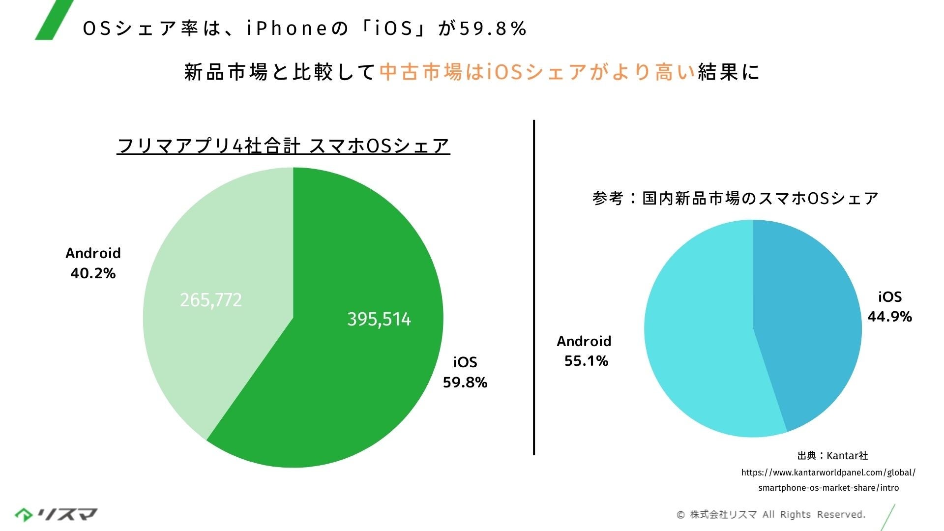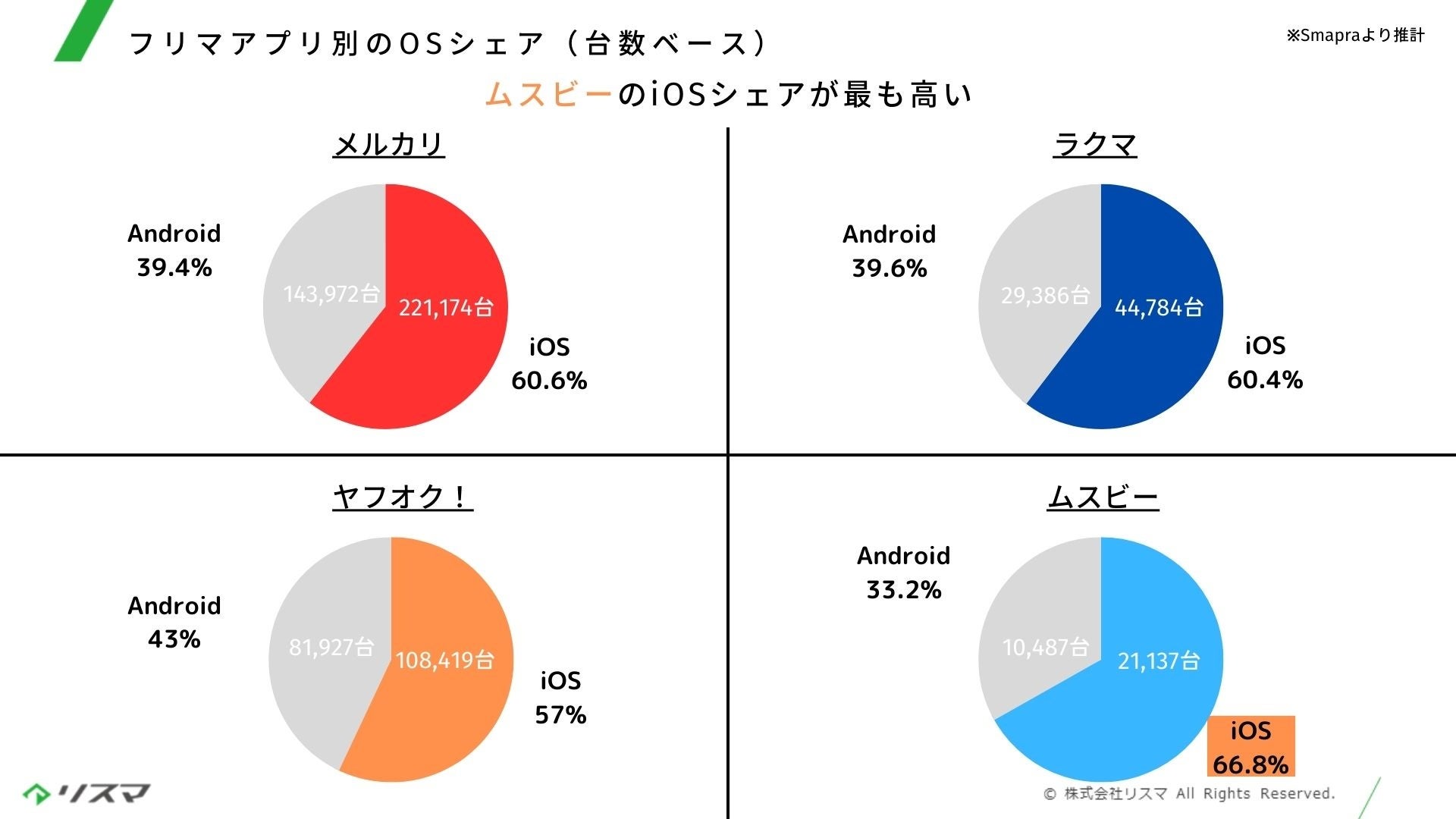 フリマアプリ4社を合計した成約件数ベースのOSシェア率は、iOSが59.8%(39.6万台)、Androidが40.2%(26.6万台)でした。また流通金額ベースで算出した場合のOSシェア率は、iOSが72.6%(約152.0億円)、Androidが27.4%(57.4億円)でした。