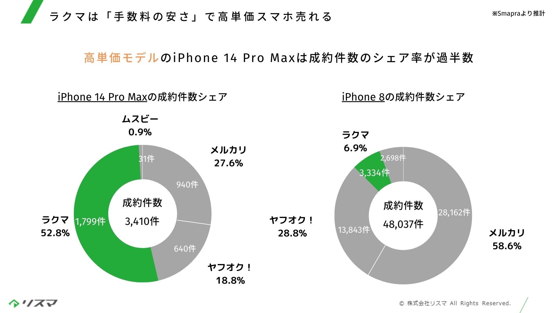 例えばiPhone 8の場合、フリマアプリ4社のなかでラクマの成約件数は3,328件、シェア率は6.9%にとどまる一方、iPhone 14Pro Maxではそれぞれ1,795件、52.5%と、過半数を占めます。