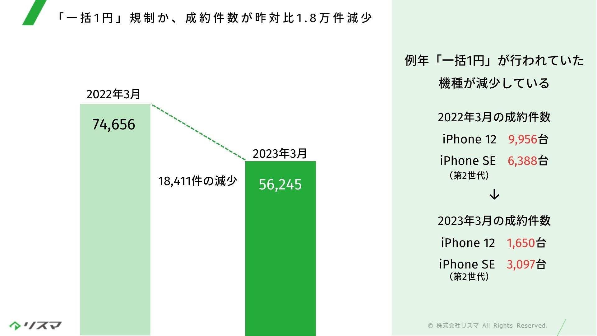 一方で、昨年3月と本年3月の成約件数を比較すると、昨対比18,411件の減少となりました。これはキャリアが例年行っていた「一括1円」などの大幅な値下げ販売が行われなくなったことによる影響と見られます。