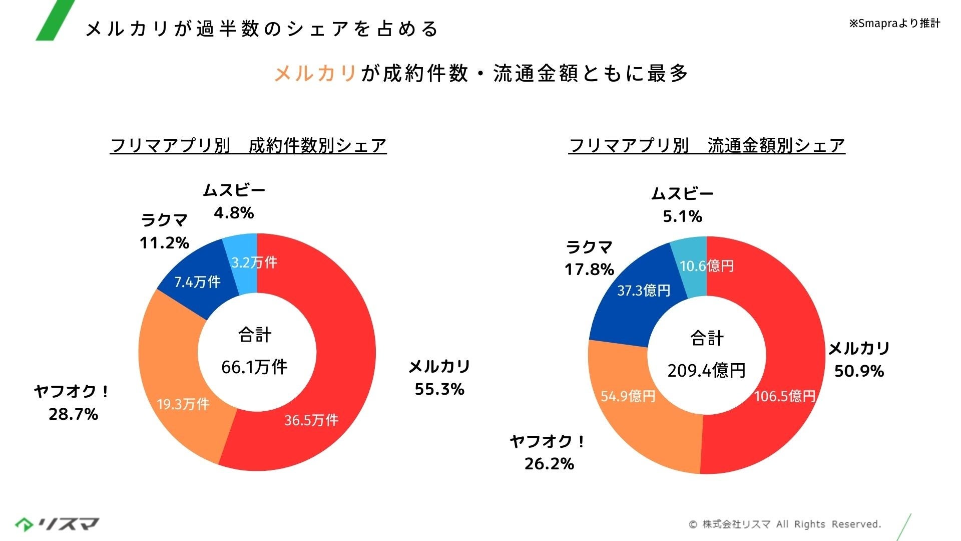 フリマアプリ4社ごとのシェア率では、メルカリが成約件数・流通金額ともに最多です。合計成約件数66.1万件のうち、メルカリは55.2%の36.5万件でした。またSmapra推計の流通金額ベースでは、総計約209.4億円のうち、メルカリが50.9%の106.5億円と、ほぼ半分のシェアを握っています。