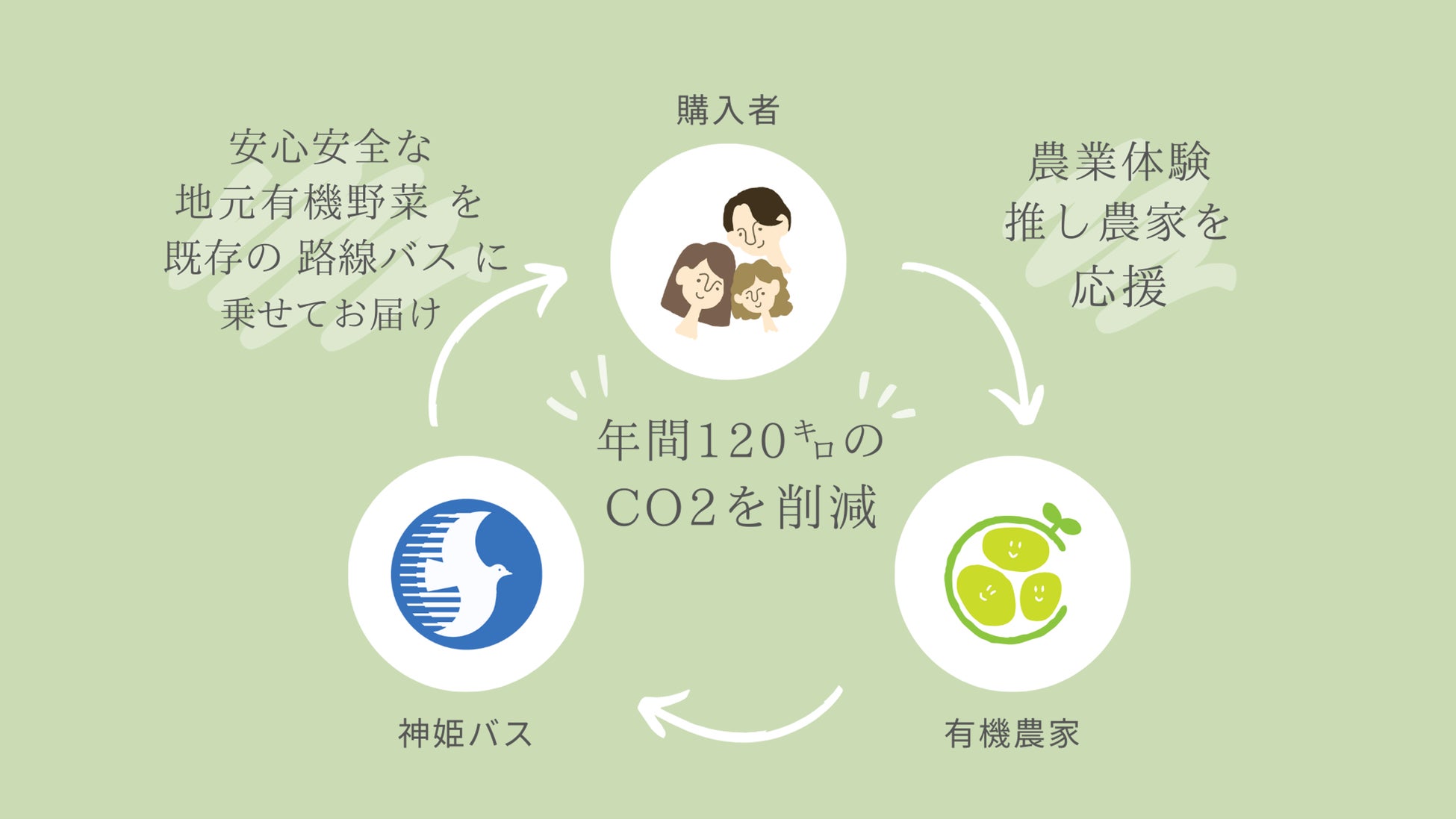 神戸市西区の有機農家が育てた新鮮な野菜を、三宮エリアまでの中距離高速路線バスを利用して直接お届けします。このプロジェクトの革新性は、"貨客混載"という新しい物流モデルの採用にあります。従来のバスの輸送空間を有効活用し、通常の乗客に加えて野菜を運搬することで、新たな輸送手段を増やすことなく効率的な物流を実現します。KOBEベジバスでは地産地消を推進し、地域の有機農家と消費者を直接結び付けます。地元で収穫された野菜を地元で消費することで、輸送時のCO2排出量を削減し、環境負荷を減らすことに貢献します。
