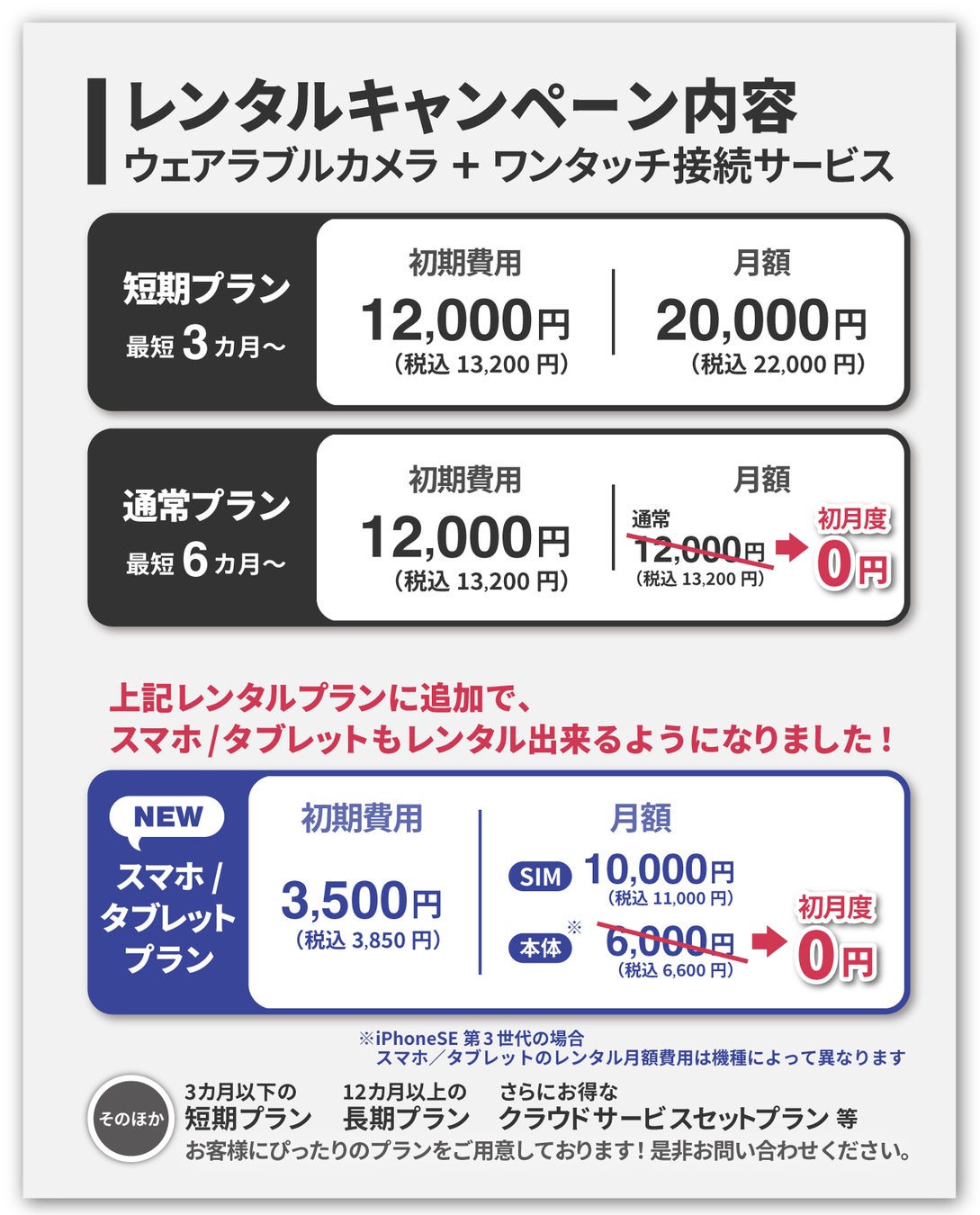 2023年1月末までに6カ月以上のスマホ/タブレット付きレンタルプランをお申込み、3月までにご利用開始されるお客様に限り、初月度レンタル費用のうち、ウェアラブルカメラのレンタル費用(税抜12,000円/月)とスマホ(またはタブレット)のレンタル費用※5 それぞれ初月度分を無料※6 とさせていただきます。