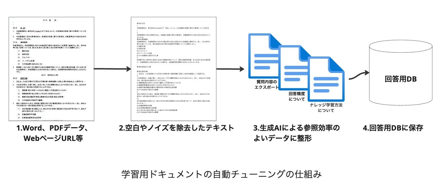 例えばカスタマーサポートの対応マニュアルや「よくある質問集」等のナレッジを学習させることで基礎的な質問への回答を自動化できたり、就業規則や育児・介護休業規程などの社内規約を学習させることで、業務負荷が高まりがちな総務部門への多岐にわたる問い合わせの自動化を実現します。