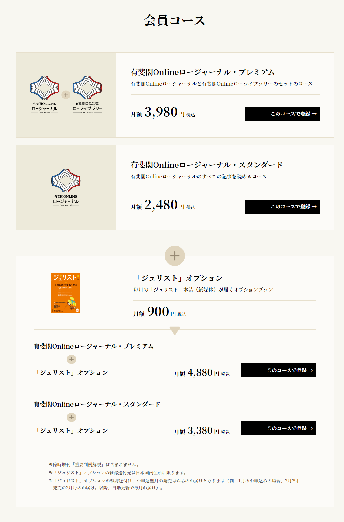 それぞれのコースには、紙媒体のジュリストを毎月お届けするオプションをつけることも可能です。臨時増刊である「重要判例解説」を除く月刊ジュリストを月額900円(税込)でお届けいたします。