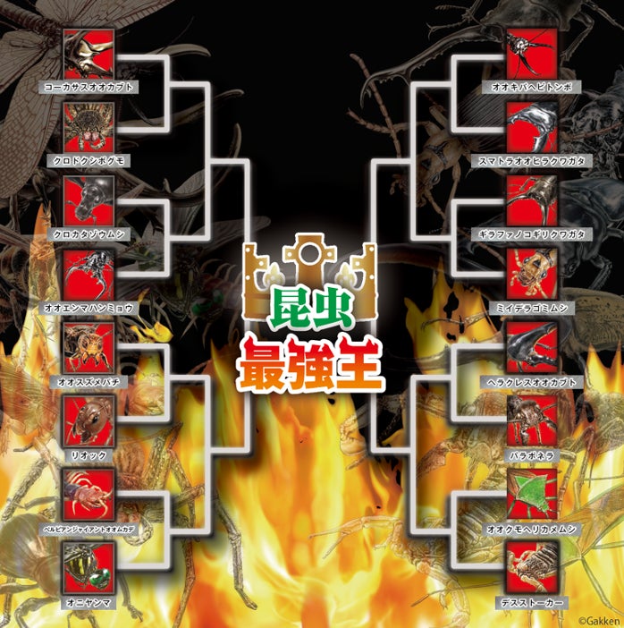そのひとつである『昆虫最強王図鑑』は、「昆虫の重量を同じにしたら、どの昆虫が最強なのだろうか?」をテーマにヘラクレスオオカブト、ギラファノコギリクワガタ、オオスズメバチ、リオックら24体の昆虫が、最強の座をかけてバトルトーナメントを繰り広げる!