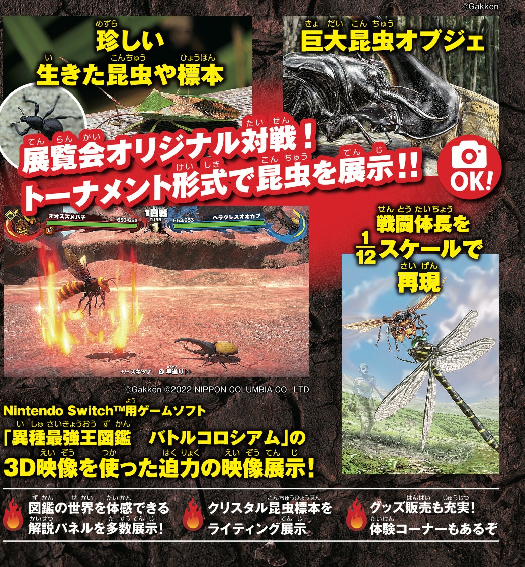 珍しい生きた昆虫や標本、巨大昆虫オブジェ、戦闘体長を1/12スケールで再現したフィギュアなどを、今回は書籍とは違う展覧会オリジナルトーナメントで紹介!