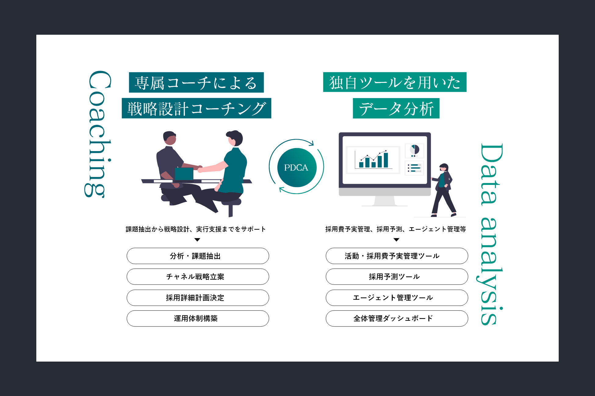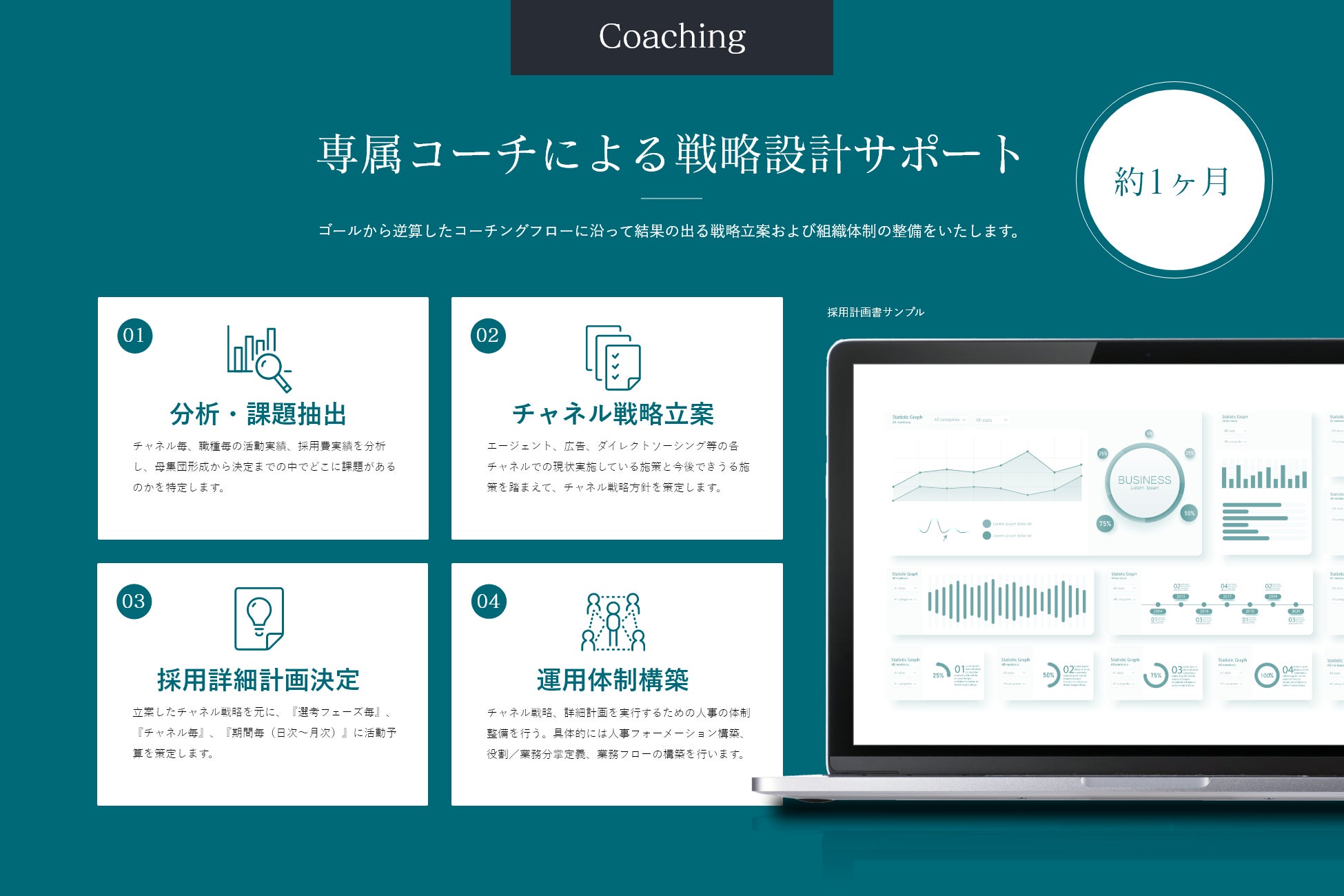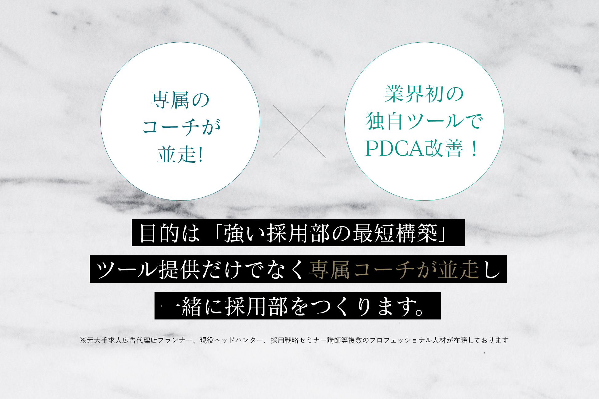 サービスの目標は「強い採用部の最短構築」です。ツール提供だけでなく、専属コーチが並走し戦略策定、戦術のサポートを伴走しながら一緒に採用部をつくります。