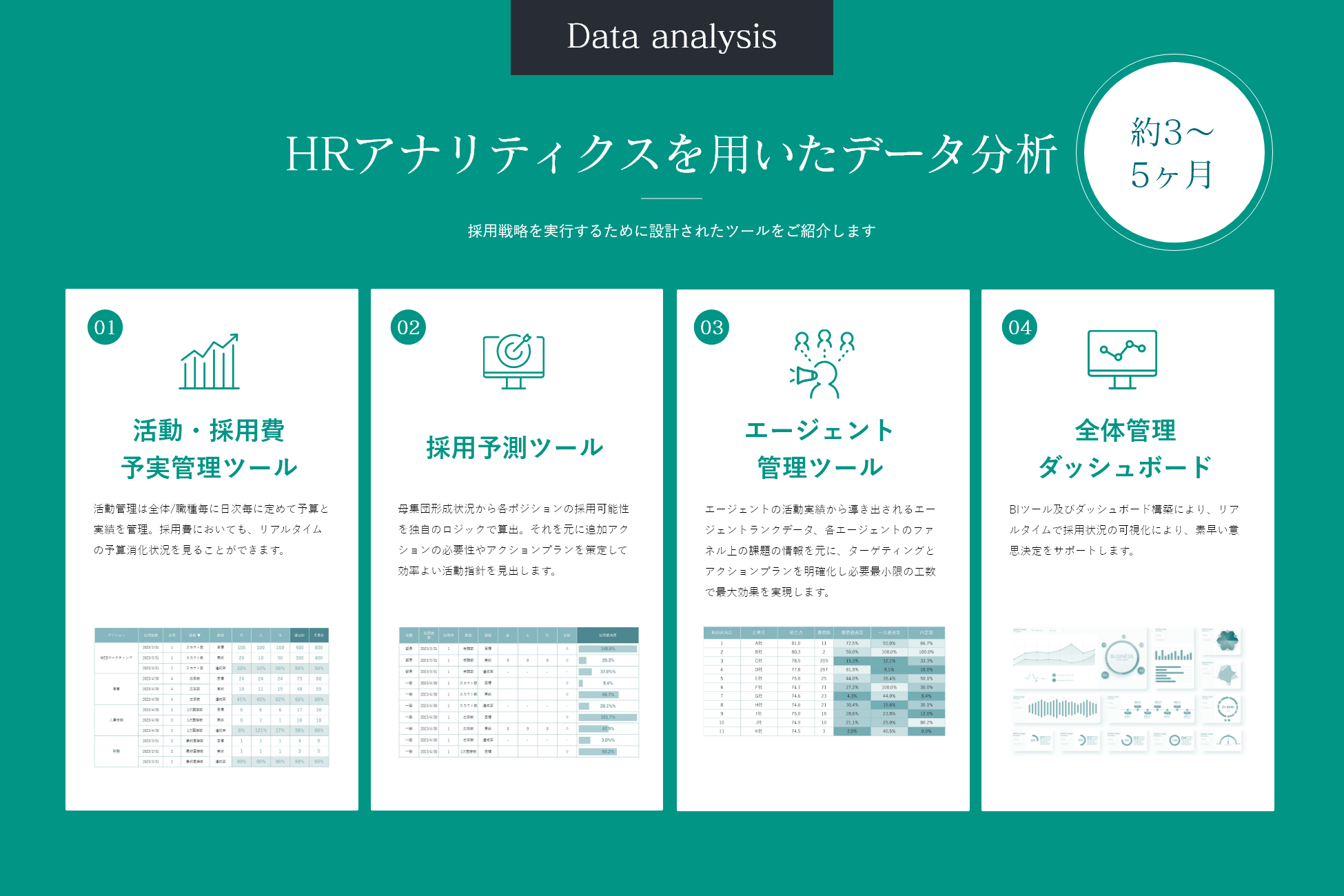 戦略策定後の戦術実行フェーズでは、簡易に分析/施策実行をすべく、”HRアナリティクス” を駆使しして、高速でPDCAサイクルを回すことによって、採用成功に導きます。