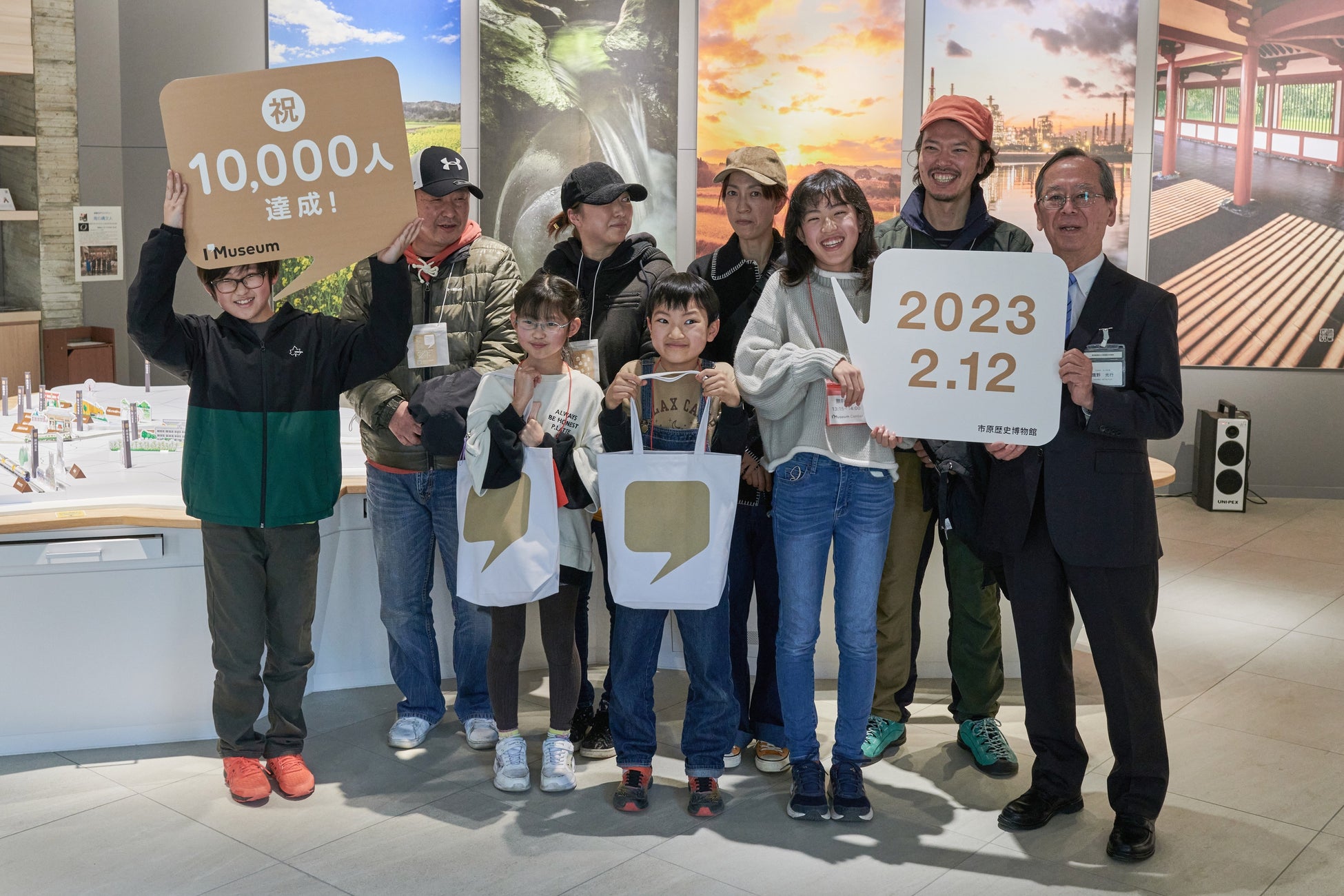 2023年2月12日(日)に、来館者数1万人突破を記念したサプライズセレモニーを実施し、1万人目の来館者となった、市原市在住の2組のご家族には オリジナルグッズの詰め合わせとスウェットパーカー(非売品)を贈呈しました。