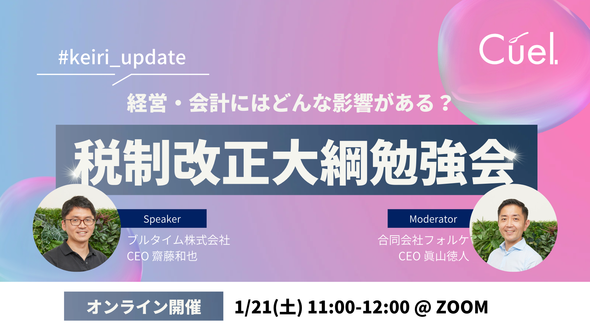本セミナーでは、令和5年度税制改正大綱に関わる最新情報と各企業への影響を、Cuel講師齋藤 / 眞山が解説します。是非、ご参加ください!