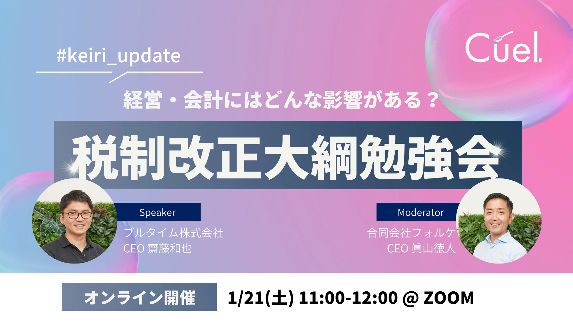 経理として今よりも活躍したい女性のための、実践的なスキルと思考力を身につけられるオンライン経理スクールコミュニティを提供する株式会社Cuelはオンラインイベント「#keiri_update 〜経営・会計にはどんな影響がある?『税制改正大綱』勉強会〜」を開催します。