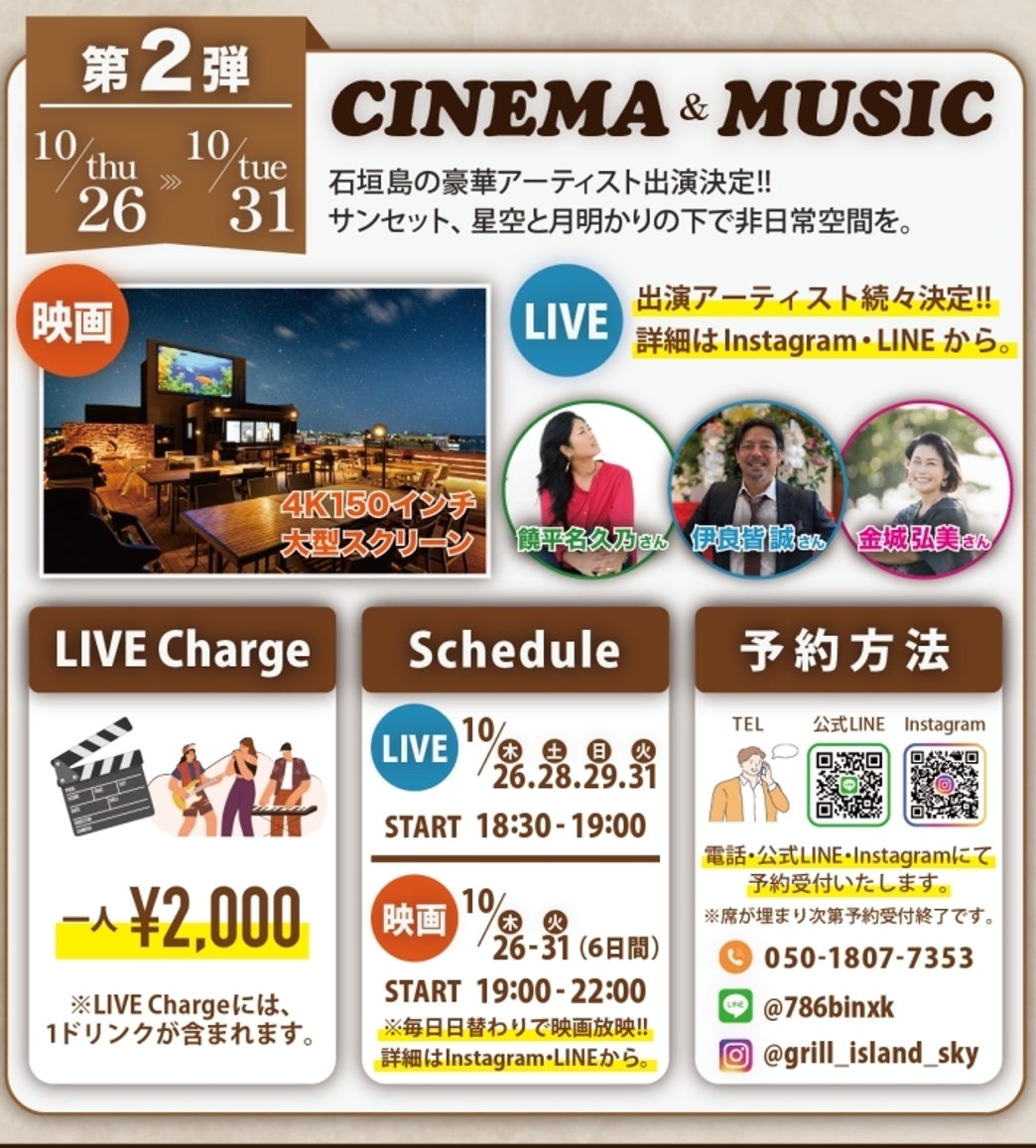 石垣島出身の豪華アーティスト達の生演奏ライブを、サンセット・星空・月明かりの下で思う存分ご堪能下さい。