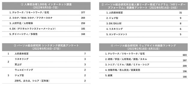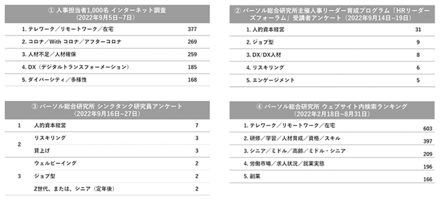 株式会社パーソル総合研究所(本社:東京都港区、代表取締役社長:萱野博行)は、2022-2023年に人事領域において注目される「人事トレンドワード2022-2023」を発表、3大ワードとして「テレワーク」、「DX人材」、「人的資本経営」を選定したことをご報告します。なお、「人事トレンドワード」の発表は、今回が初となります。