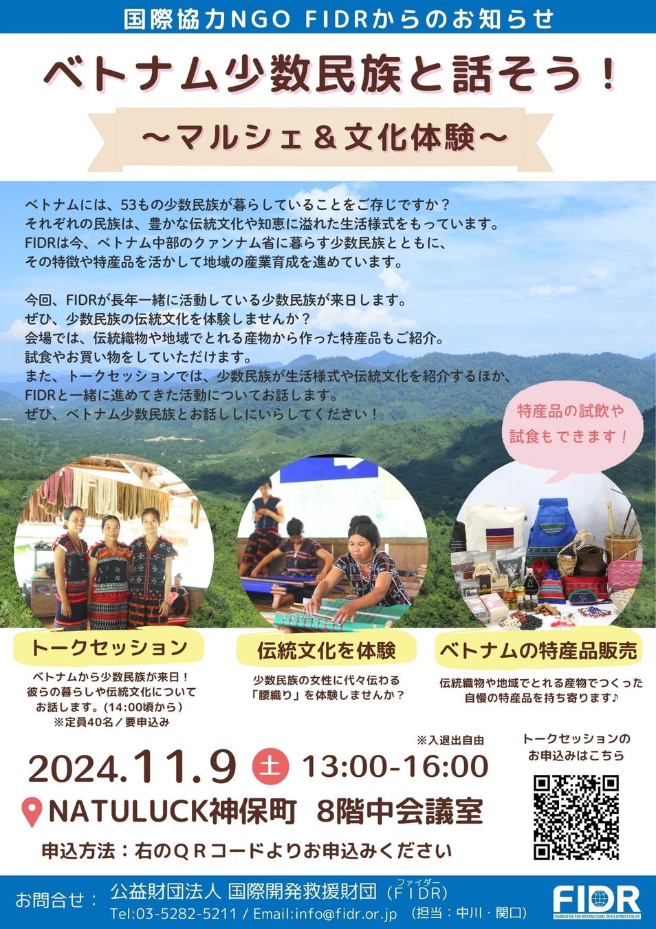この度、これらの取り組みを地域で主導する少数民族の人々と、FIDRベトナム事務所スタッフが来日し、11月9日(土)13:00より交流イベントを開催します。