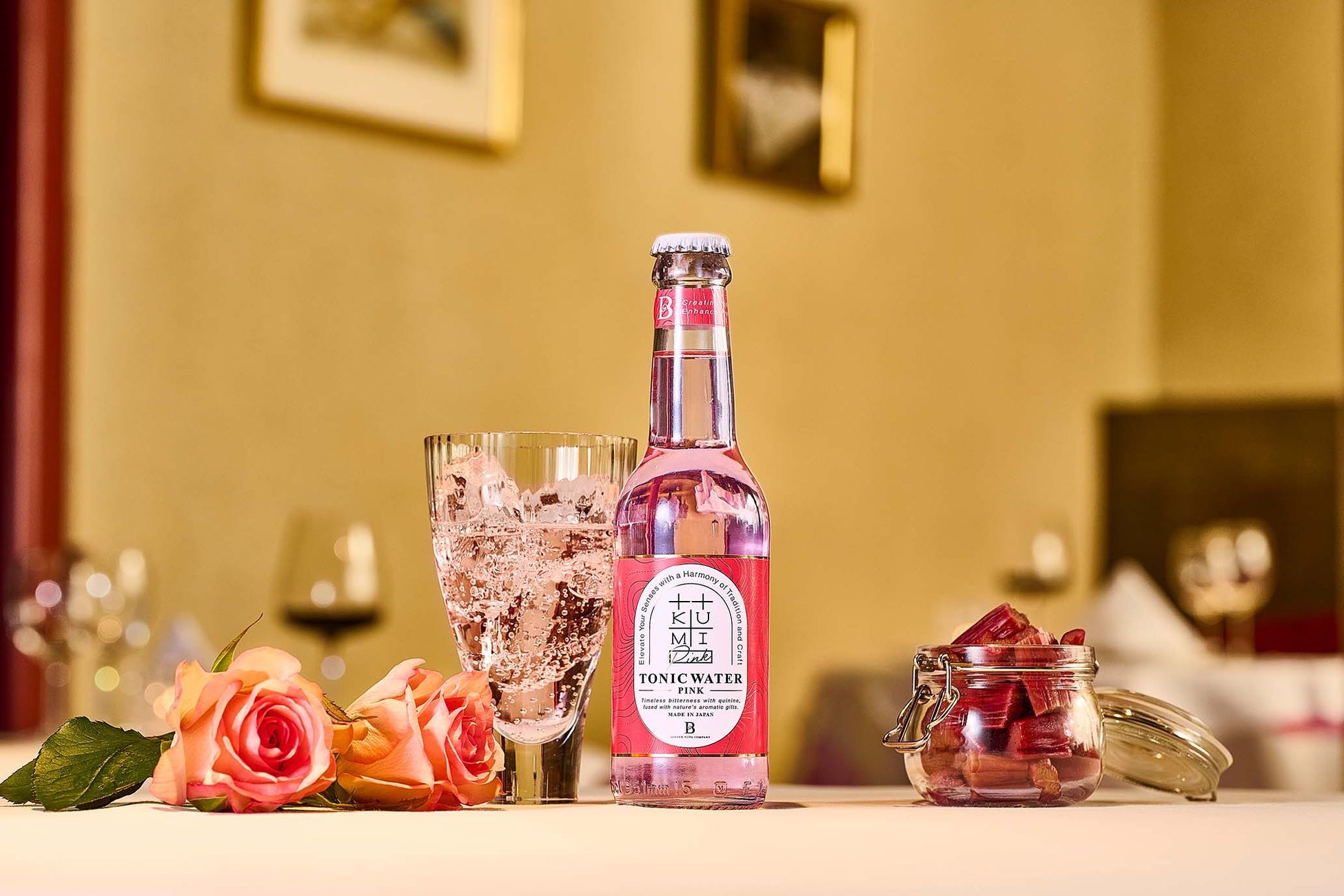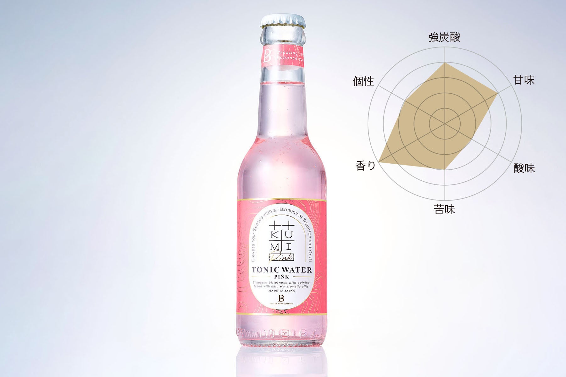 【KUMI PINK】は、華やかな気持ちになれるトニックです。強い香りはつけず、ジンとの相性も大切に仕上げました。ローズとルバーブを組み合わせ、可愛らしく華やかで、気分があがる香りをイメージしています。すっきりとした甘味はくどくなく、ボトルの最後の一滴まで美味しくお召し上がりいただけます。また、苦味は控えめにしていますので、そのままノンアルコールドリンクとしても気軽にお楽しみいただけます。