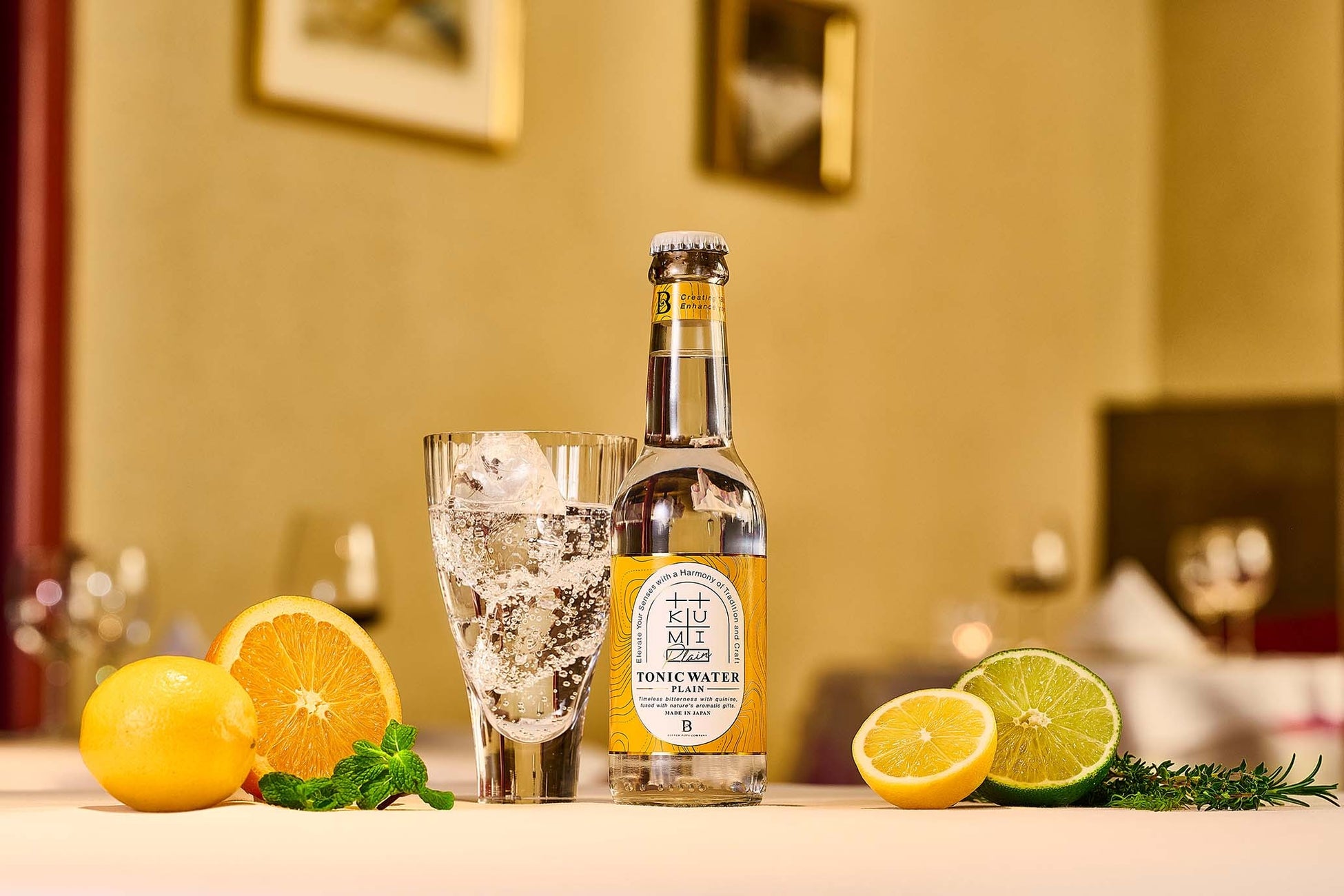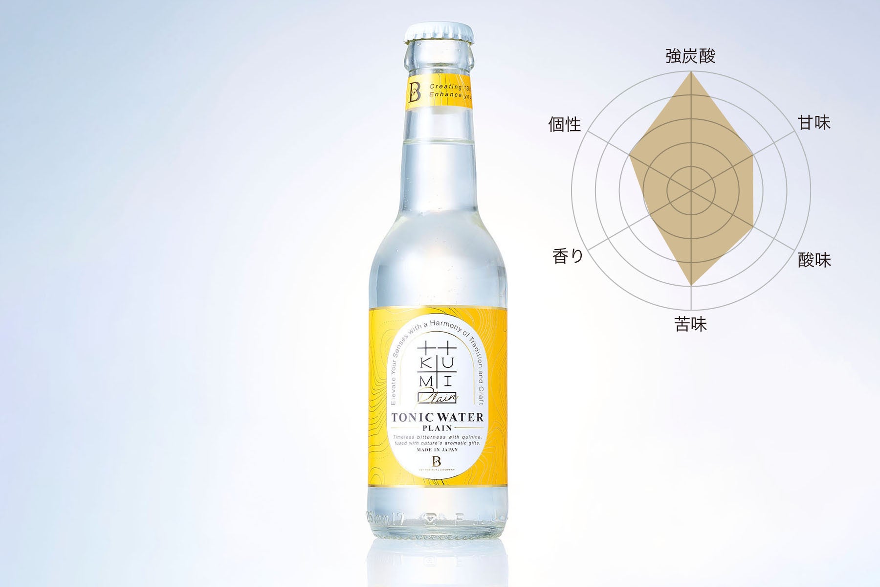 【KUMI PLAIN】は、シンプルさを追求したプレーントニックです。クラフトジンと合わせて楽しむことを考えて作られています。こちらのプレーントニックにはあえて目立つ香りを付けていません。やさしいレモンピールとダイダイの香りで仕上げていますので、カクテルに使用することでジンの香りをより一層引き立てます。また、果実や香草との相性もよく、レシピの可能性は無限大。キナ由来の苦味は強めにしていますが、クラフトジンの味わいを補って深めてくれることでしょう。