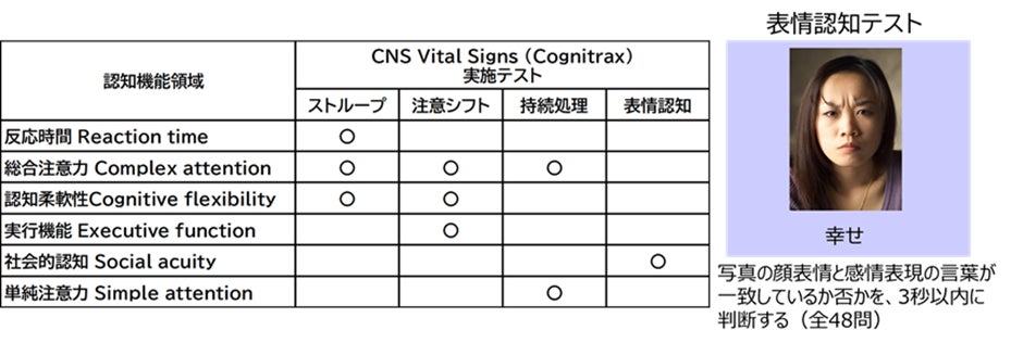 全10項目のテストで構成されるパソコンを用いた認知機能検査。本研究では他の神経心理学的検査との重複を避けるため、ストループテスト(文字の色と意味が合っているか判断します。例:青という文字が黒い色で書かれている)・注意シフトテスト(提示図形△□に対してランダムに切り替わる指示「色が同じ」「形が同じ」に合う図形を選ぶ)・持続処理テスト(ランダムに表示される文字の中で特定の文字が出たときのみキーを押す)・表情認知テスト(写真に表示された表情と下に書かれた感情の説明表現(穏やか・幸せ・悲しみ・怒り)の意味が一致しているか判断する)の4種を実施しました。