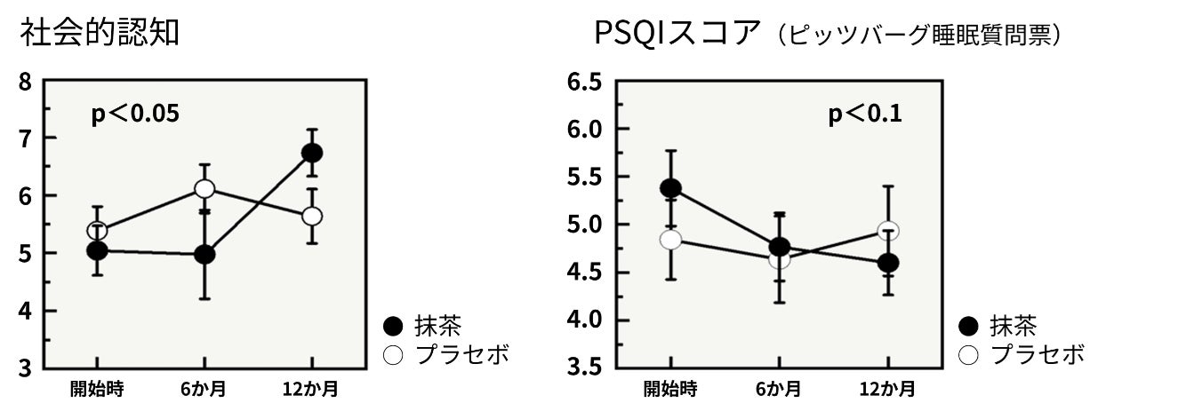 認知機能に関しては、認知症やMCIのスクリーニング等に用いられる神経心理学的検査(MMSE-J、MoCA-J等)での得点で抹茶群とプラセボ群の間に差はみられませんでしたが、コグニトラックス検査(CNS Vital Signs日本語版)(※用語5)による認知機能の領域別の評価では、抹茶群はプラセボ群に比較して、表情認知テストで表される社会的認知、具体的には顔表情からの感情知覚の精度が有意に改善することが確認されました(図・左)。また、睡眠の質についてピッツバーグ睡眠質問票(PSQI)(※用語6)を用いて評価した結果、抹茶群でPSQIスコアが低下し、睡眠の質が向上する傾向が示されました(図・右)。