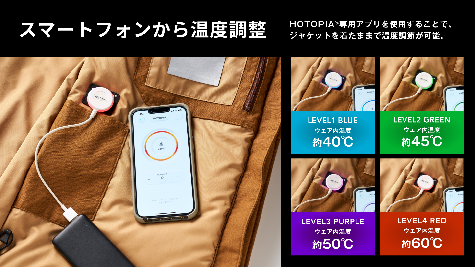 4)スマートフォンで4段階の衣服内温度調整(手動も対応)