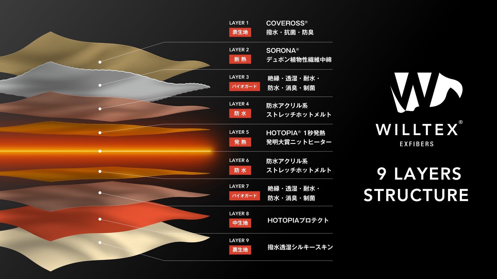 生地は9レイヤー構造と機能性をより高める作りとなっています。