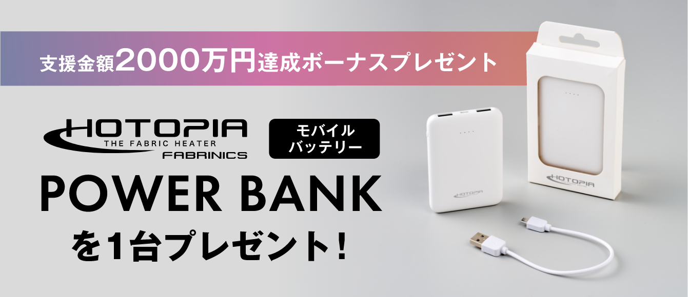この度、TIMELINEにて「WILLTEX®」プロジェクトの支援金額が2000万円を超えた場合、支援していただいた皆様全員にHOTOPIA® POWER BANK(モバイルバッテリー)を1台プレゼントいたします。