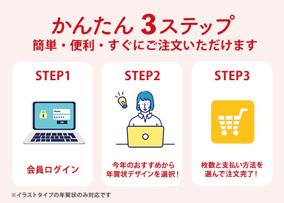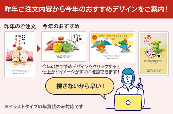 昨年ご注文の年賀状デザインから今年のおすすめ年賀状をご案内する「年賀状クイックオーダー」機能はリニューアルし、よりスピーディーで簡単に注文することが可能となりました。