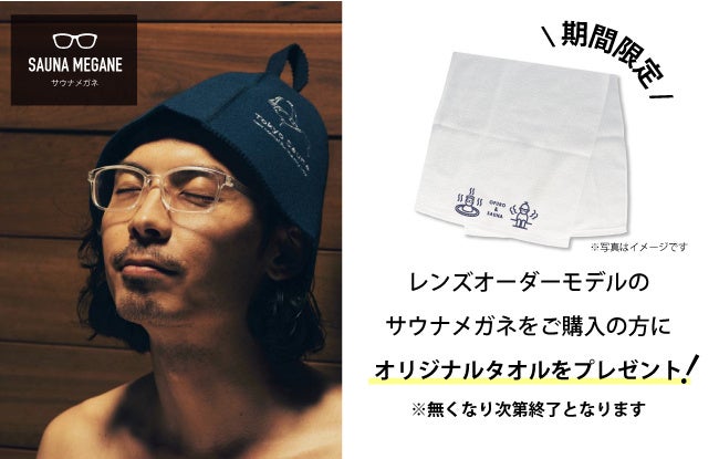 レンズオーダーモデルのサウナメガネをご購入いただいたお客様に限り、サウナや銭湯で使いたい!オリジナルタオルをプレゼントいたします。