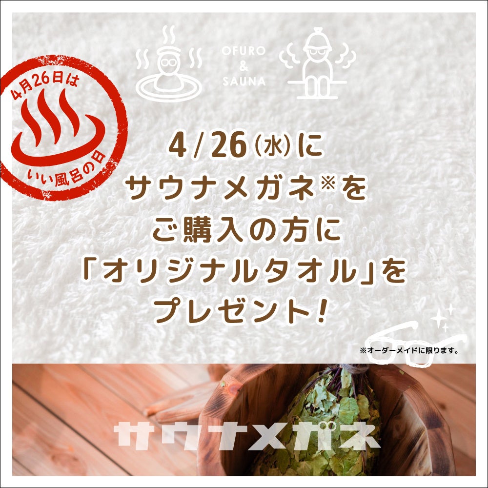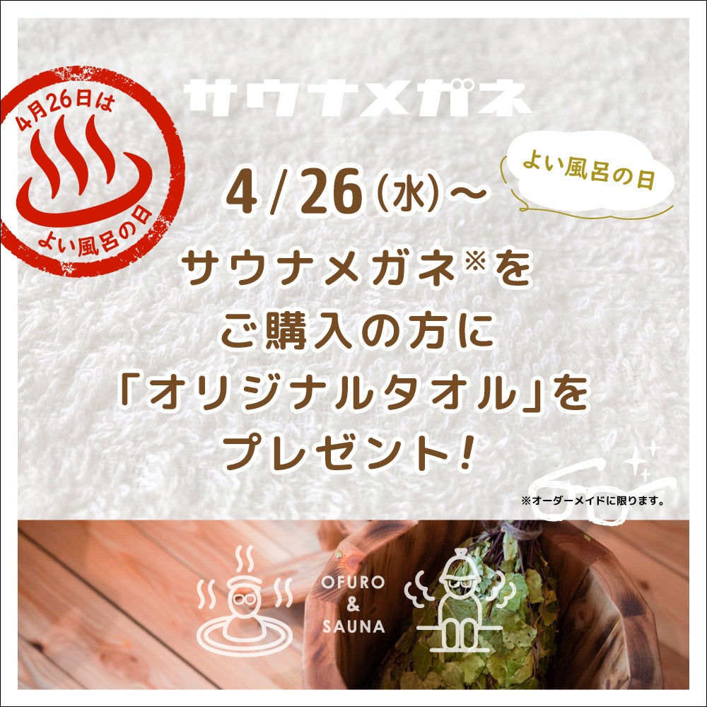 4月26日はよい風呂の日ということで、いつもサウナメガネをご愛顧いただいているお客様に感謝の気持ちを込めて<オリジナルタオルプレゼントフェア>を開催いたします!