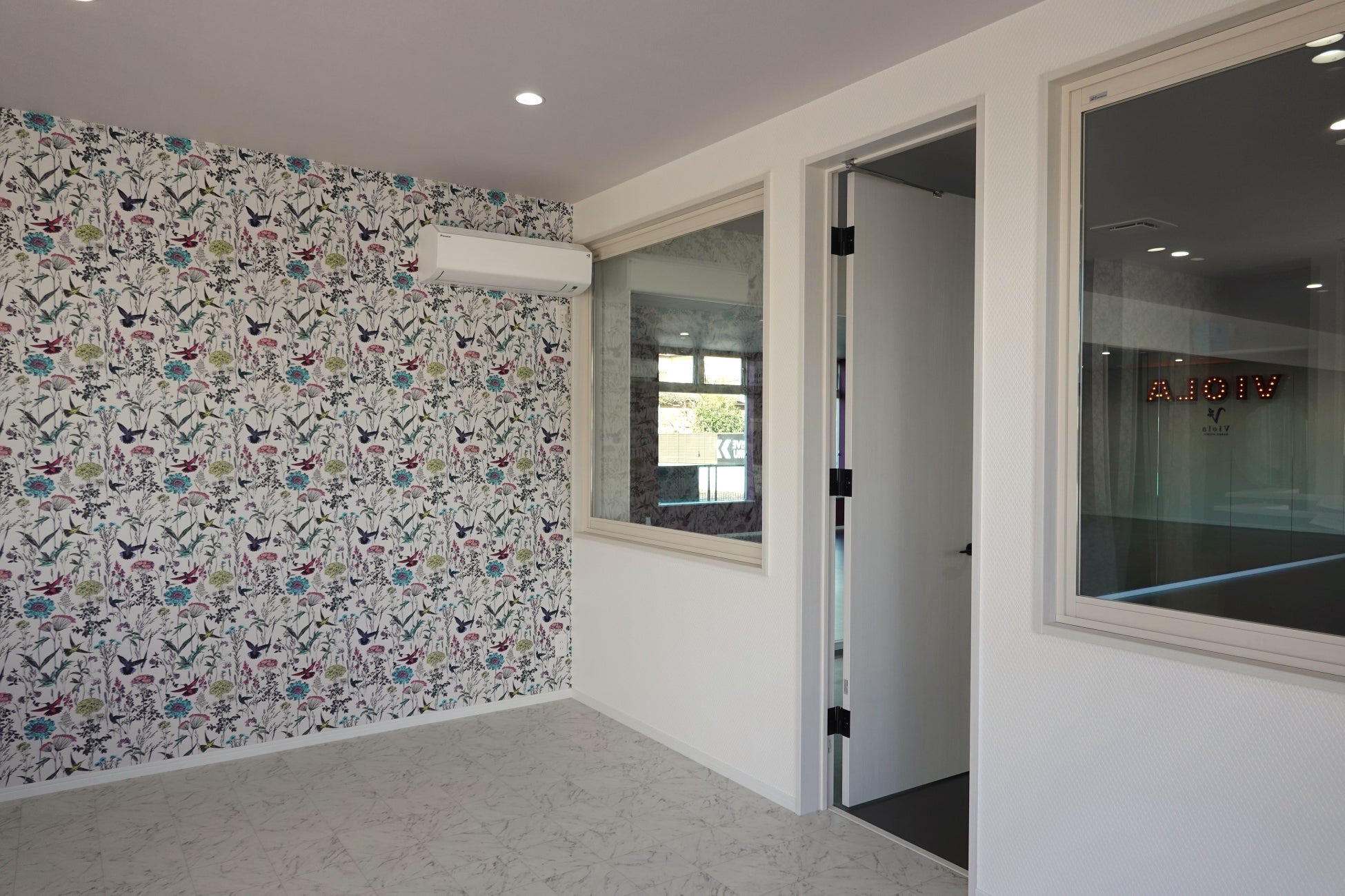 重めな印象にならないように、スタジオカラーである紫⾊の壁紙を使⽤し、⽣徒さんや親御さんも楽しめるようにインスタ映えのするデザイン看板をつけました。