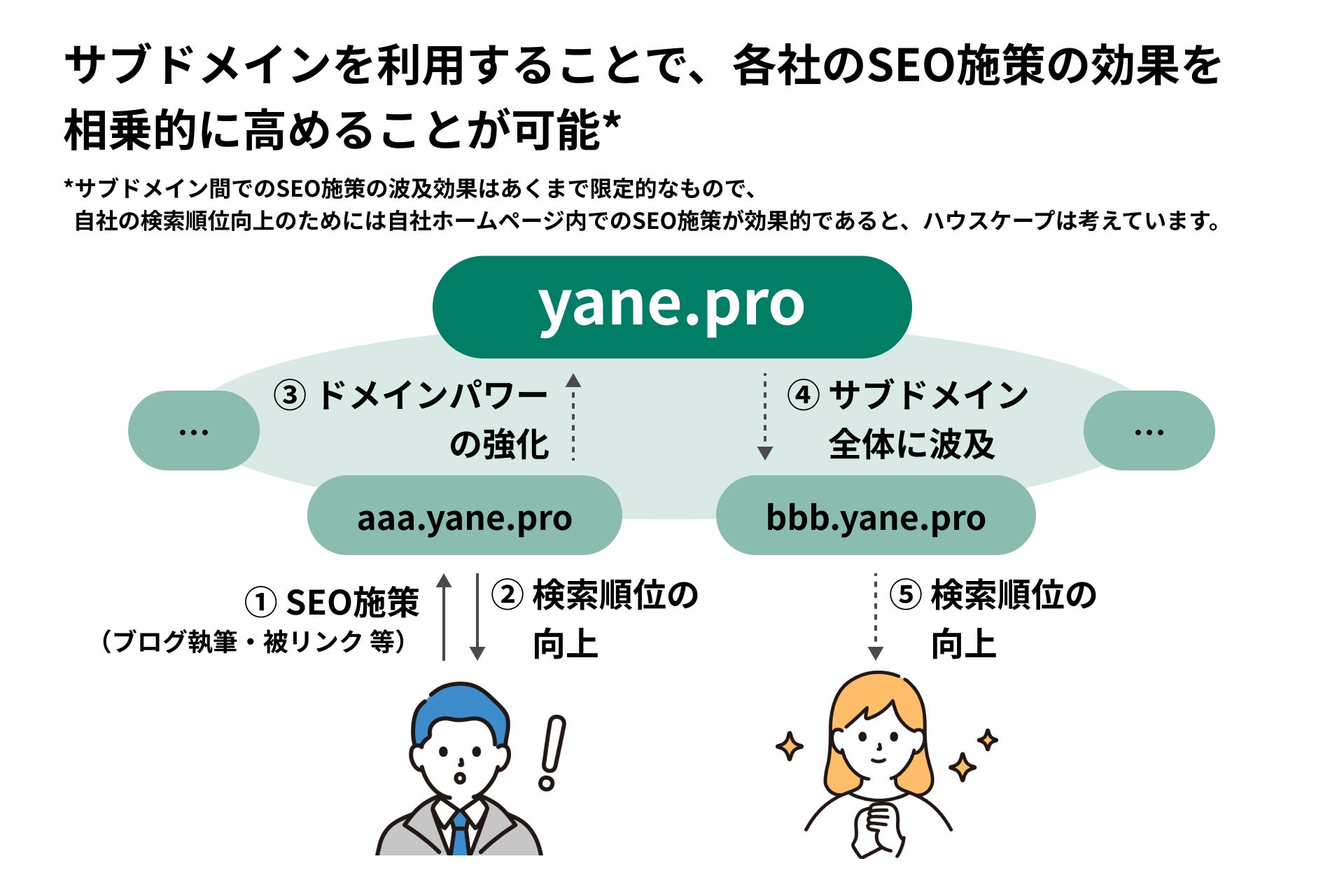 ただし、サブドメイン間でのSEO施策の波及効果はあくまで限定的なもので、自社のホームページの検索順位を上げるためには自社ホームページ内でのSEOが効果的であると、ハウスケープは考えています。