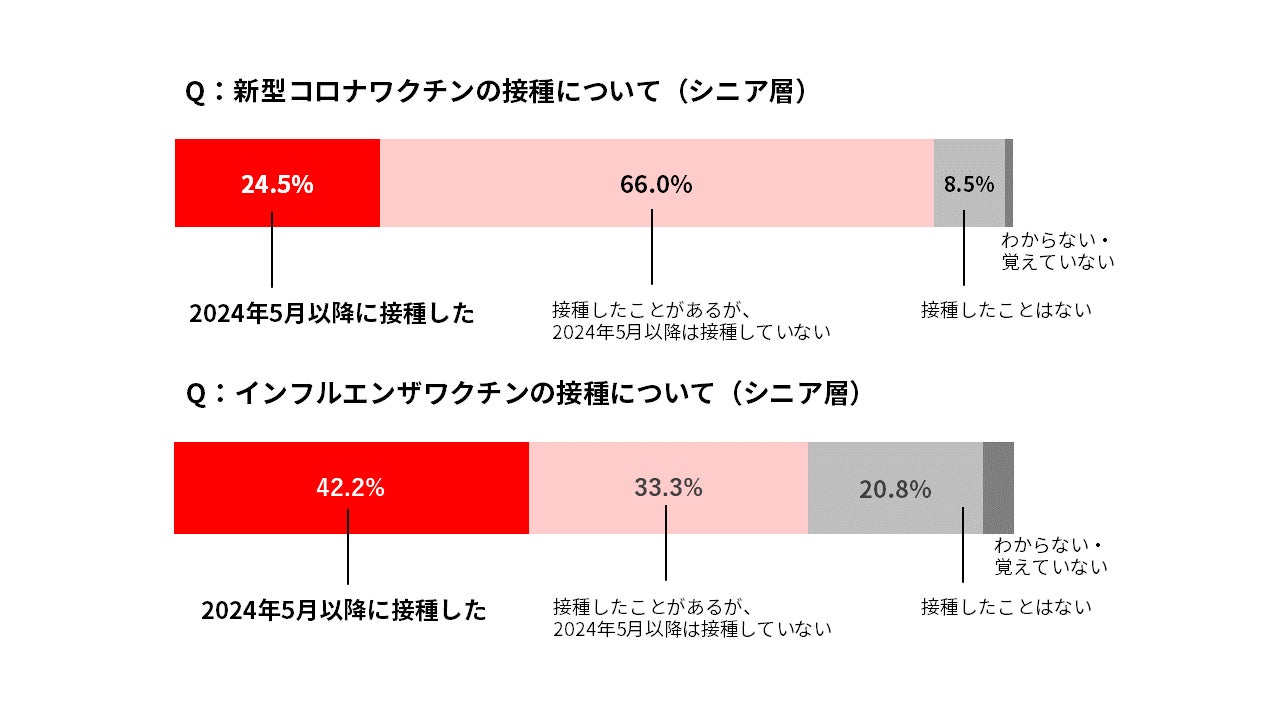昨年2024年に新型コロナワクチンを接種したシニア層は24.5%、一方でインフルエンザワクチンを接種したシニア層は42.2%であり、接種率に大きな差がありました。
