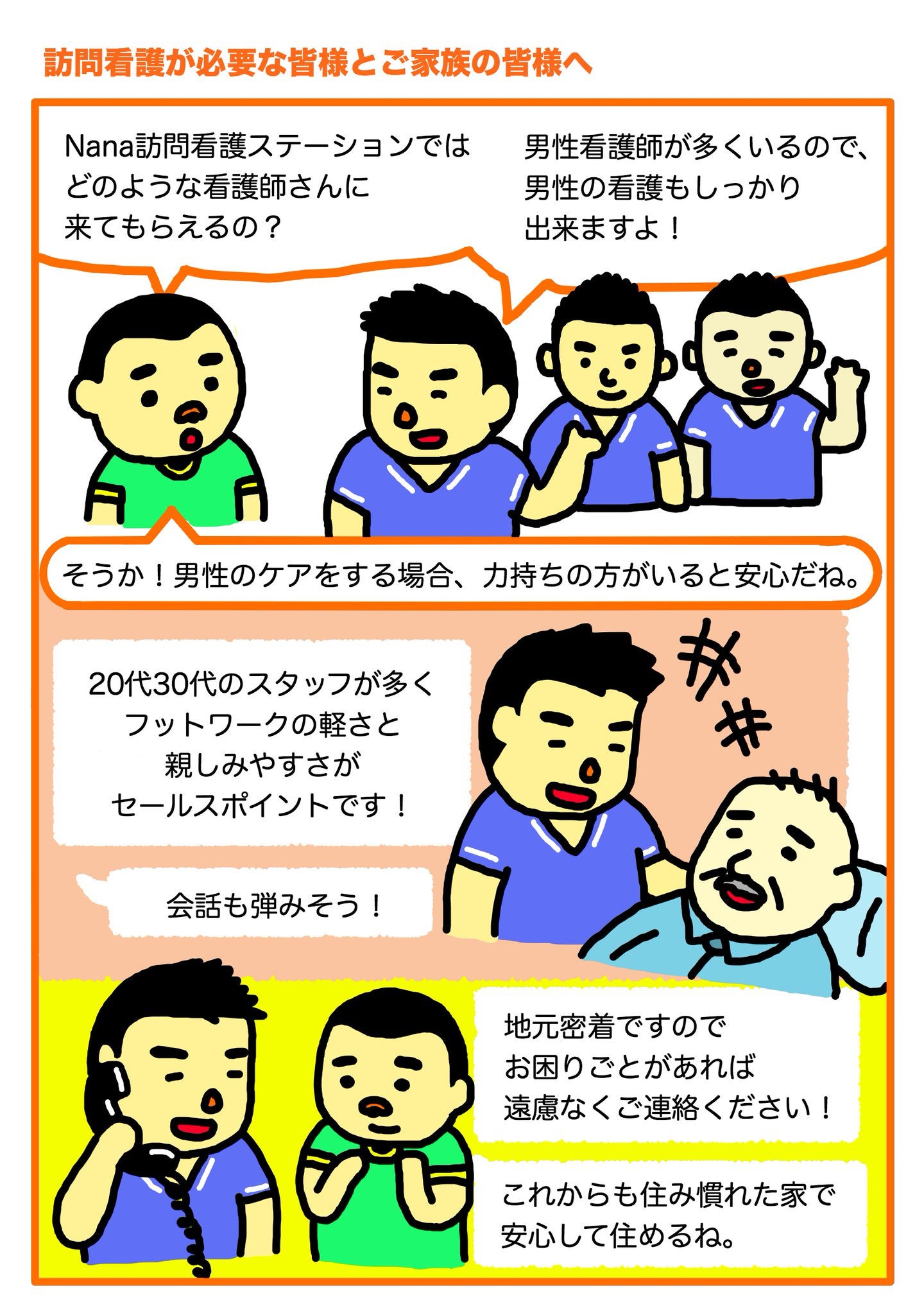 Nana訪問看護ステーション下井草(杉並区中野区エリア)は、若い男性スタッフが多いことが特徴です。