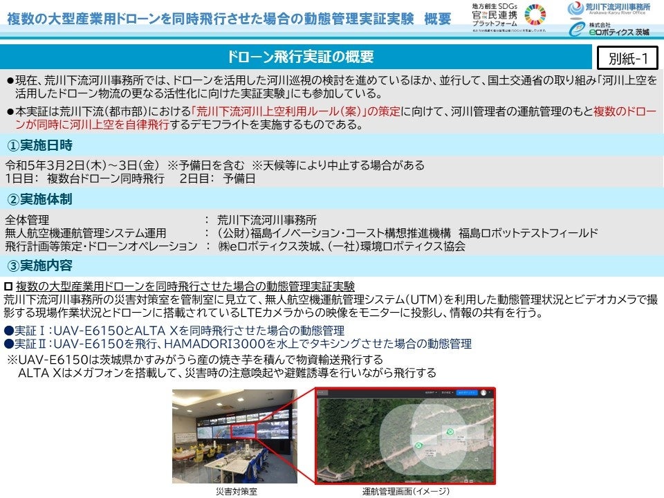 (株)eロボティクス茨城(茨城県かすみがうら市、代表:板羽昌之)と(一社)環境ロボティクス協会(東京都港区、事務局長:勝部善之)は、(公財)福島イノベーション・コースト構想推進機構 福島ロボットテストフィールド(福島県南相馬市)の協力を得て、国土交通省 関東地方整備局 荒川下流河川事務所(東京都、事務所長:出口桂輔)と合同で、荒川下流河川内で複数の大型産業用ドローンを同時飛行させた場合の動態管理実証試験を行います。荒川下流河川事務所は、荒川下流(都市部)における「荒川下流河川上空利用ルール」の策定を目指しています。