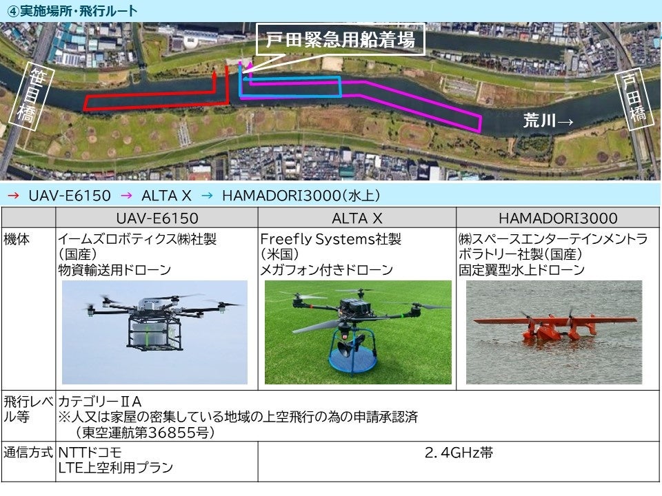 国土交通省 関東地方整備局 荒川下流河川事務所管内の荒川河川内で、複数の大型産業用ドローンを同時飛行させた場合の動態管理実証試験を行います。