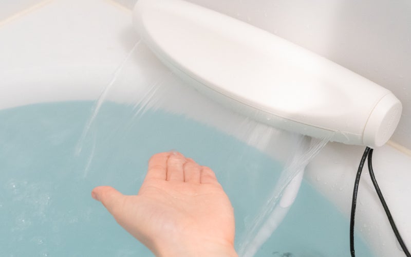 本体ユニットをお風呂の壁に吸盤またはマグネットで取り付けし、ポンプを浴槽内に吸盤で固定。あとは電源をコンセントにさせば準備完了。本体右側スイッチ部をセットすれば本体から温かいお湯が出て、首から肩をなでるようにやさしく身体を包み込み、リラックスできます。全身浴だけでなく上半身が冷えやすい半身浴でも身体をしっかりと温めます。浴槽内のお湯を使用する循環式で、お湯を無駄にせず、ガス代や電気代も節約。電気代も1時間使っても約1円と経済的です。入浴剤※も使用可能。(※推奨する入浴剤のみ使用可能)