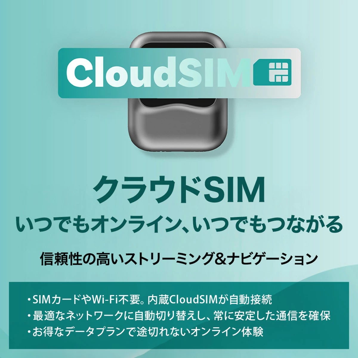 内蔵のクラウドSIM機能を使うことで、電源を入れるだけで自動的にインターネットに接続。走行エリアに応じて、最適なモバイルネットワークへ切り替わるため、常に安定した通信環境が確保されます。従来通り、物理SIMカードやスマホのテザリングの利用も可能です。