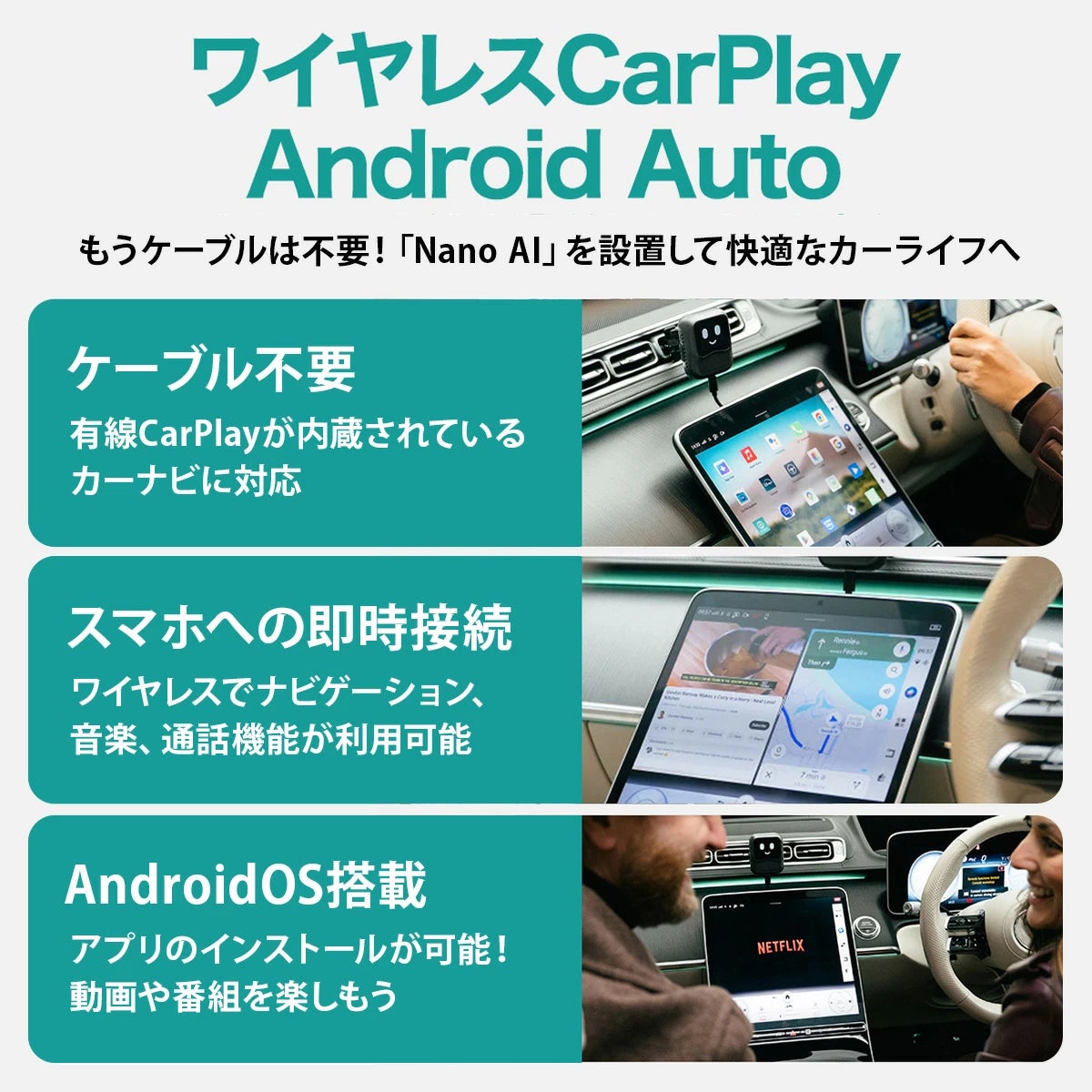 車のナビを使ってYouTubeやNetflixを観られる車載AIデバイス「OTTOCAST ai box NANO」。手のひらサイズのコンパクトな本体は、車のUSBポートに接続するだけのかんたん設計となっています。