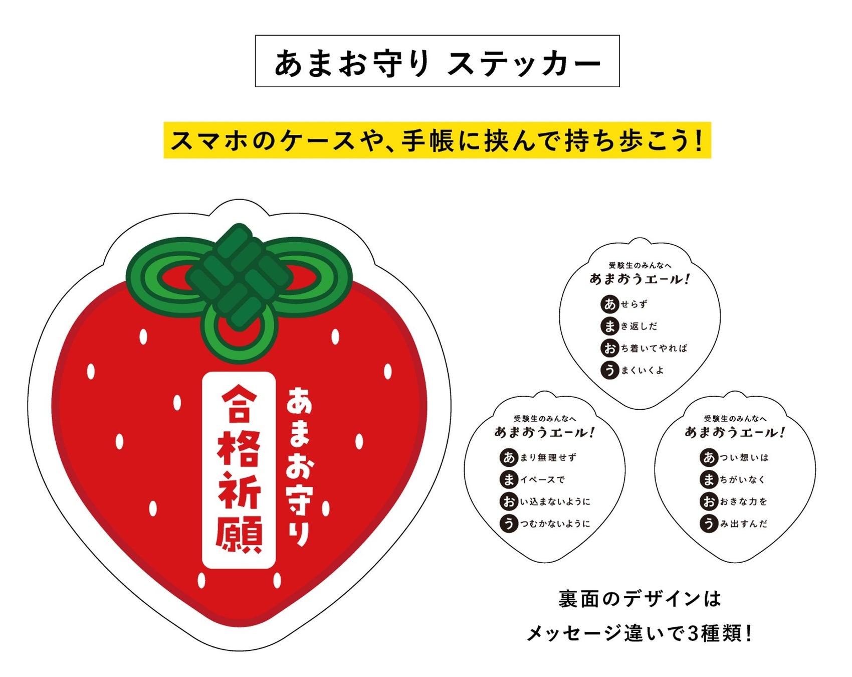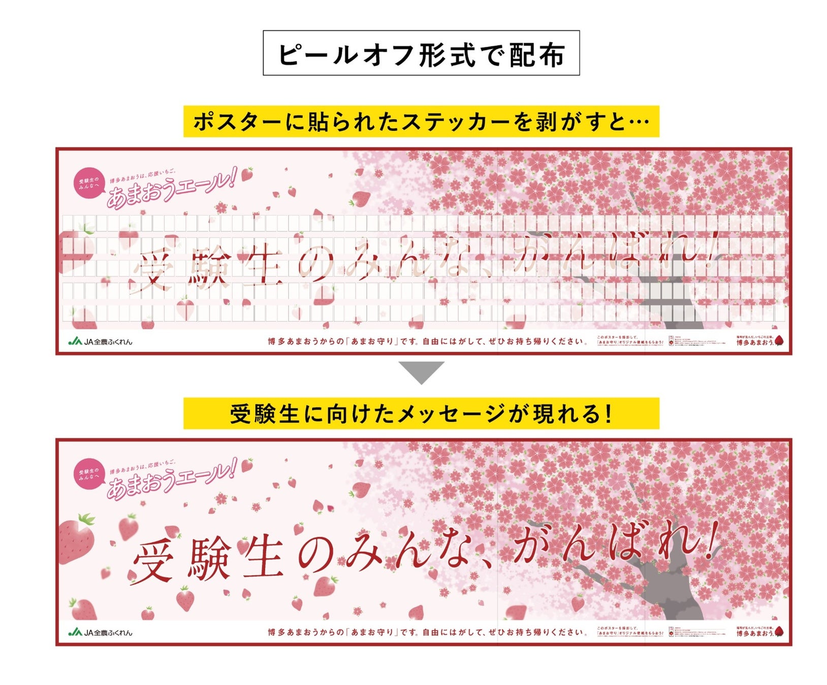 全国農業協同組合連合会福岡県本部(所在地:福岡県福岡市中央区天神4丁目5−23 JA全農ふくれんビル、代表:県本部長 栁 健二) ・JA全農ふくれんいちご部会は、頑張る受験生に向けて「あまお守りステッカー」を西鉄天神駅・西鉄太宰府駅で無料配布します。指定箇所に掲出されたポスターに貼られたステッカーを持ち帰れるピールオフ形式で配布を実施します。