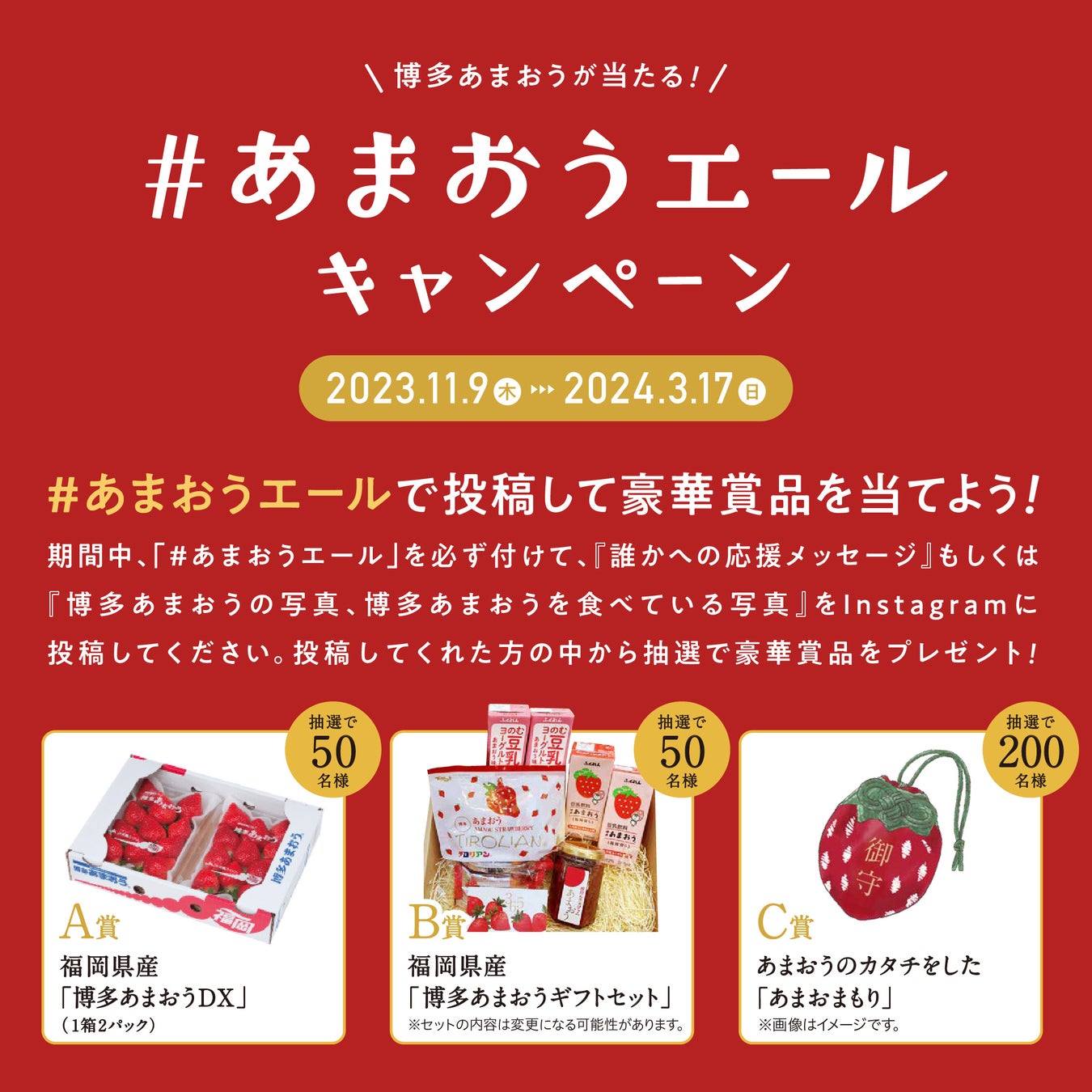期間中に「#あまおうエール」をつけて『誰かへの応援メッセージ』や『博多あまおうの写真、博多あまおうを食べている写真』をInstagramに投稿した方の中から抽選で合計400名様に豪華賞品をプレゼントいたします。