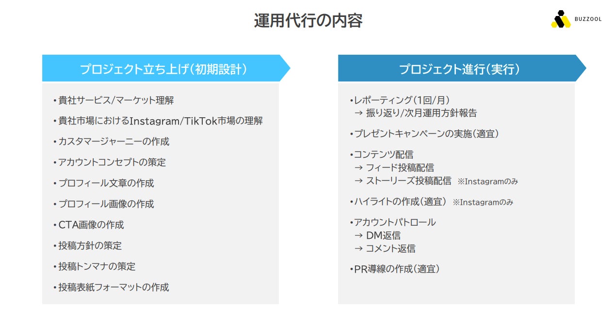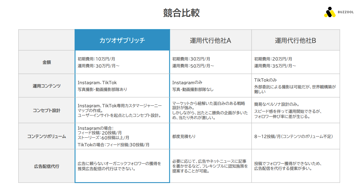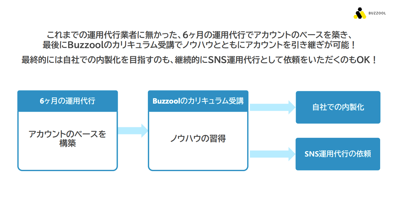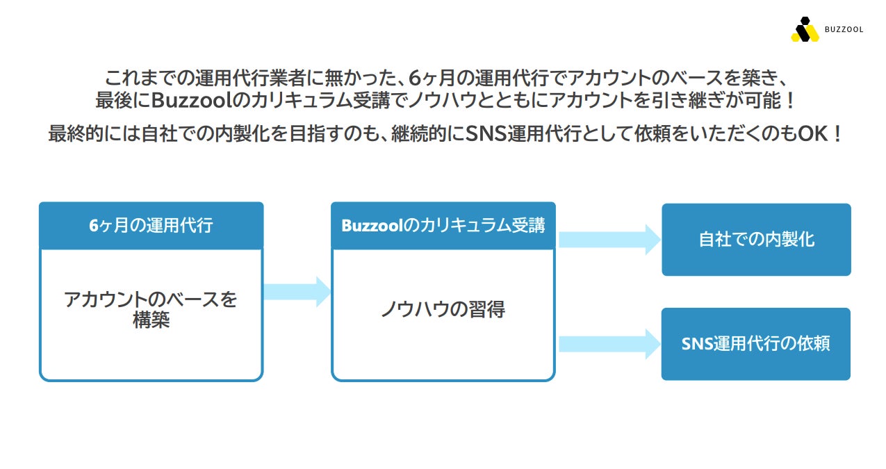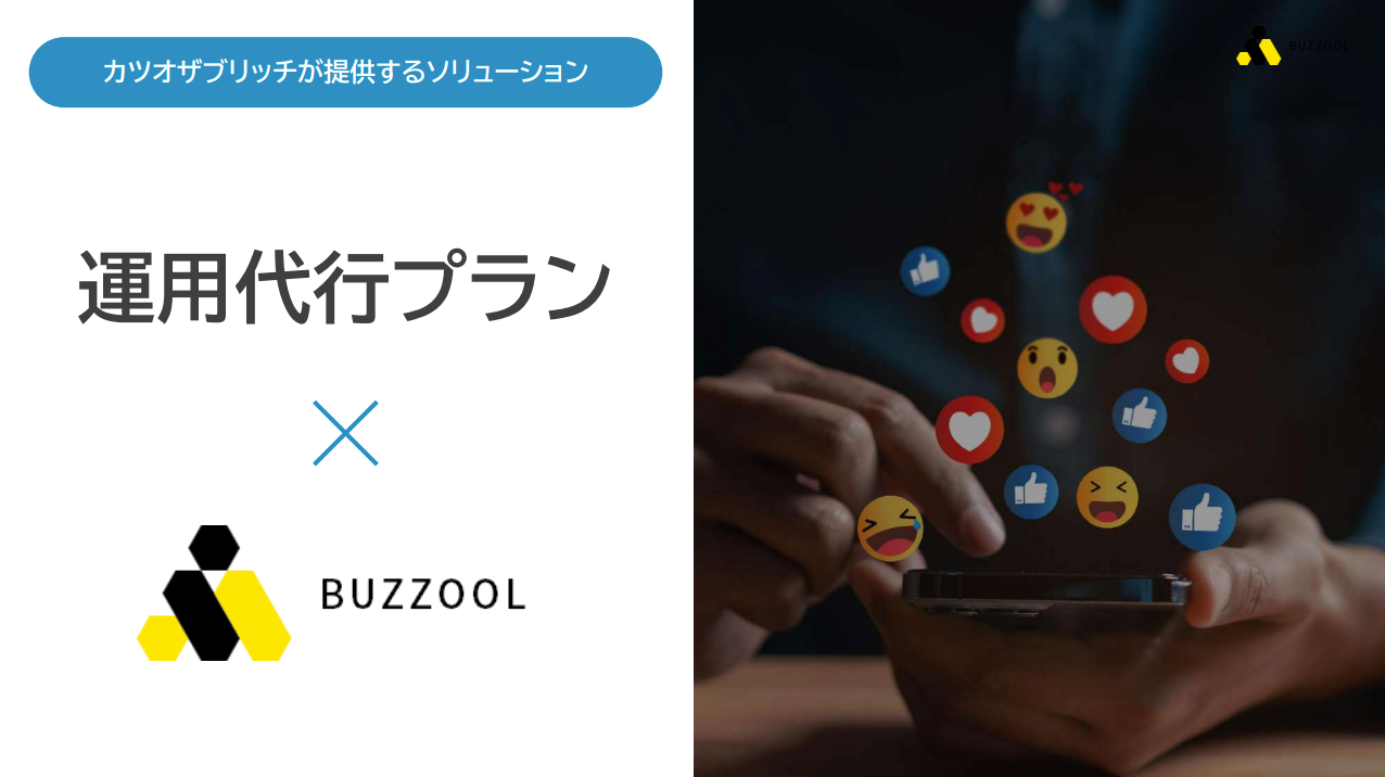 Buzzoolは株式会社カツオザブリッチが提供する「ゼロから影響力のあるアカウントを育てる」ことを目的としたSNS特化型マーケティング支援サービスです。アカウント運用時の最初の関門である6ヶ月の期間の運用を「圧倒的コスパ」で「伴走型コンサルティング」を通して6ヶ月後は「これまでの運用内容」と「これからの施策」を研修させていただくことで確実な内製化をご提供いたします。