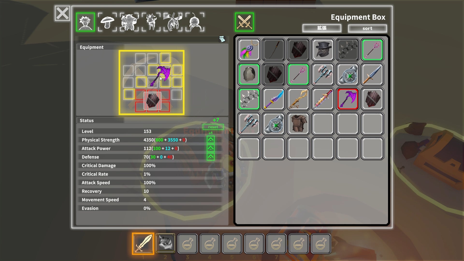 プレイヤーやモンスターは、装備品を装備することでステータスを強化できます。